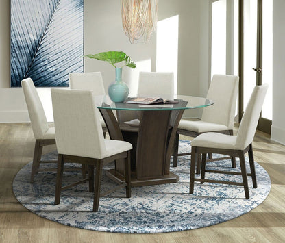 The simply stunning Dapper Dining Room Collection is perfect for entertaining multiple guests at dinner or having a casual brunch. Topped off with a sleek, clear glass tabletop, this glass dining table displays an abundance of style. The arched walnut legs come with a storage shelf through the center for added support, and the sharp, minimalist lines add a chic, modern vibe to your space. Dress up this exquisite dining table with a floral centerpiece for a pretty pop.