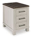 Make a farmhouse-inspired statement with this end table. Beautifully crafted to stand the test of time, the planked effect and clean two-tone finish lend a relaxing vintage feel. Spacious storage drawers with metal pulls double up on form and function. Plus, this end table's dual USB charging ports keep up with your high-tech lifestyle.| Full Dimension | 18W x 24D x 24H |