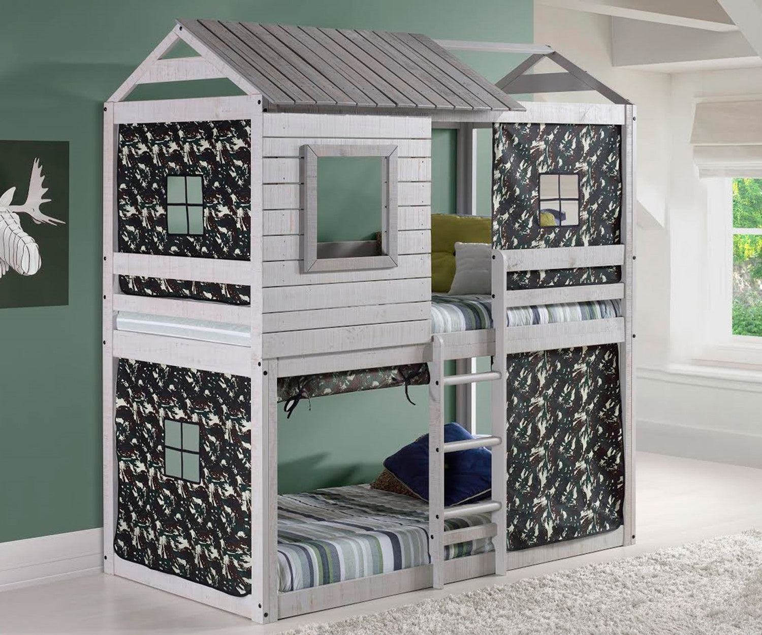 Introducing our Deer Blind Rustic Twin over Twin Light Grey House Bunkbed, a rustic masterpiece designed to elevate your child's bedroom into a cozy haven. Crafted with love and precision by Donco Kids, this bunk bed boasts a rich, rustic light grey finish that effortlessly complements any room decor. Our bed comes with a sturdy slat system, eliminating the need for a Bunkie board, ensuring your child's safety and comfort.