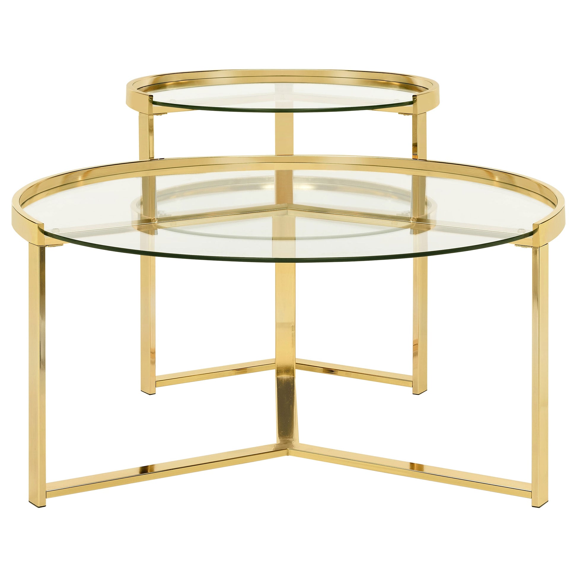 With just a bit of glam style, this casual nesting coffee table set is bright, light, and pleasing. Your living room or family room comes to life with a table set including one large and one small round table that display side by side and nestle together between uses. Pie cut out tops are fitted with a clear tempered glass insert, adding sparkling brilliance. Tripod-style chrome bases create a gleaming effect. A pencil polish edge profile combines with glass transparency to create the effect of floating discs, creating a timeless look with effortless beauty.