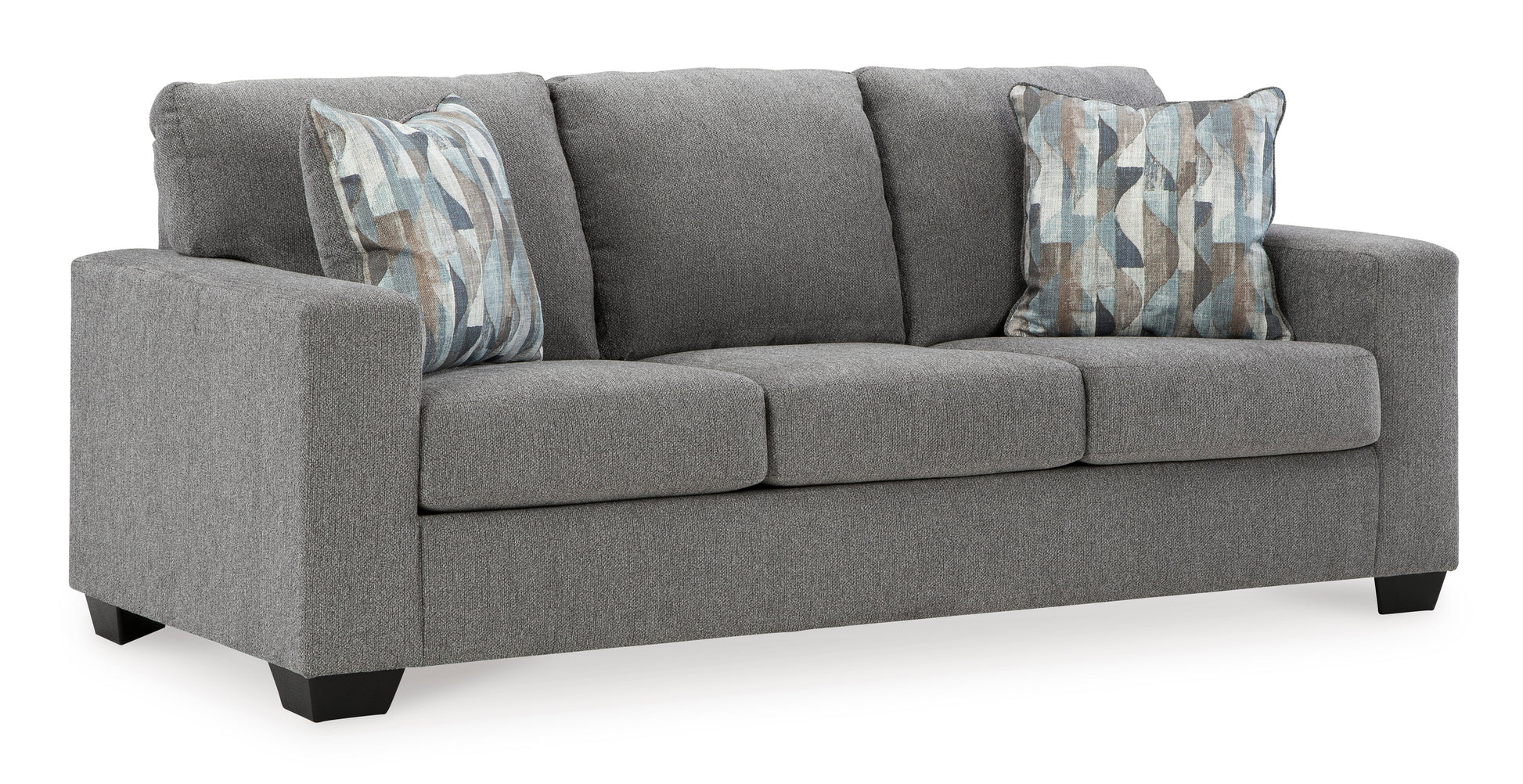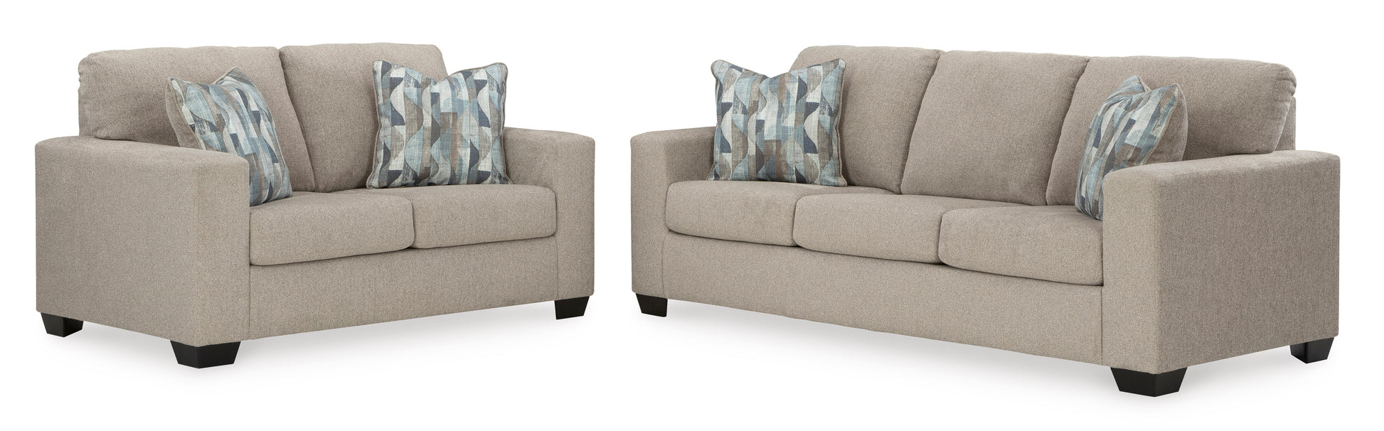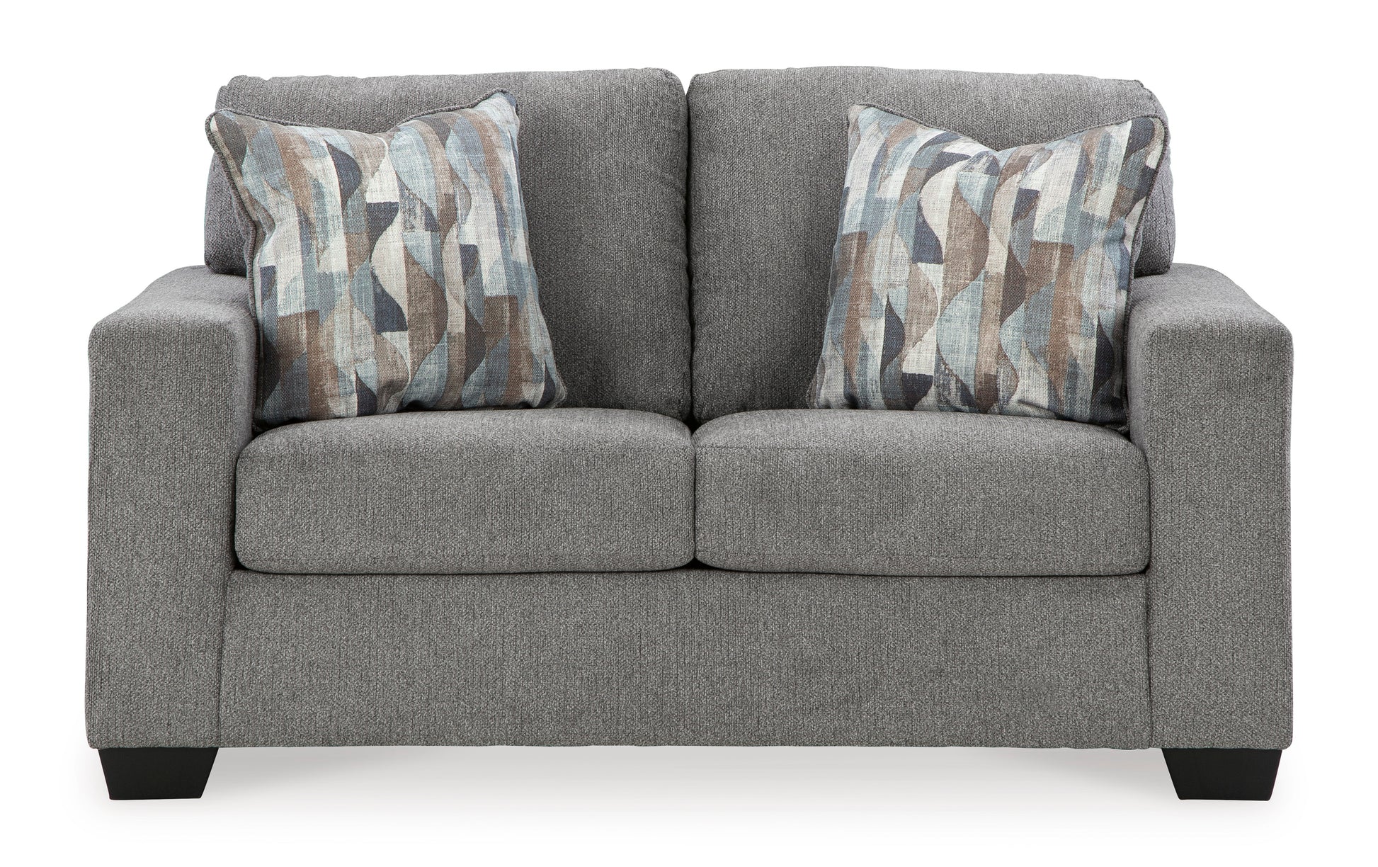 You’re in for a neat treat with this set. Its comfy seats are covered in soft, textural upholstery, and the wide track arms are eager to support your quest for total relaxation. Distressed abstract toss pillows bring a fresh breath of contemporary style while accentuating their color.