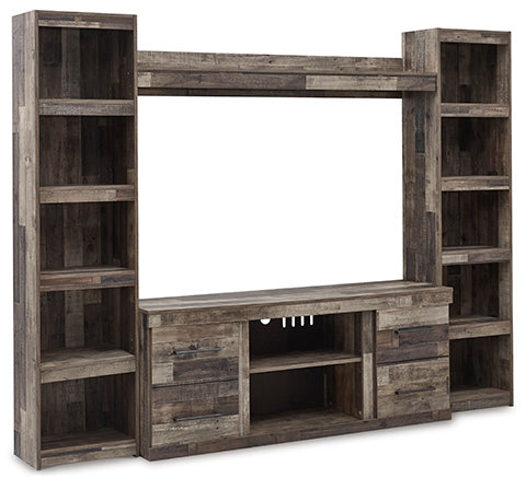 Make this entertainment center the center of attention with its popular urban eclectic style. Its rustic finish over a replicated pine grain creates an authentic natural look for your home entertainment area. You'll love its functionality. Two tall piers with open shelving allow you to put home accents on display, safely out of the way, while the TV stand’s two spacious cabinets with shelved storage easily accommodate media needs.| Full Dimension | 94.25W x 15.5D x 72H |