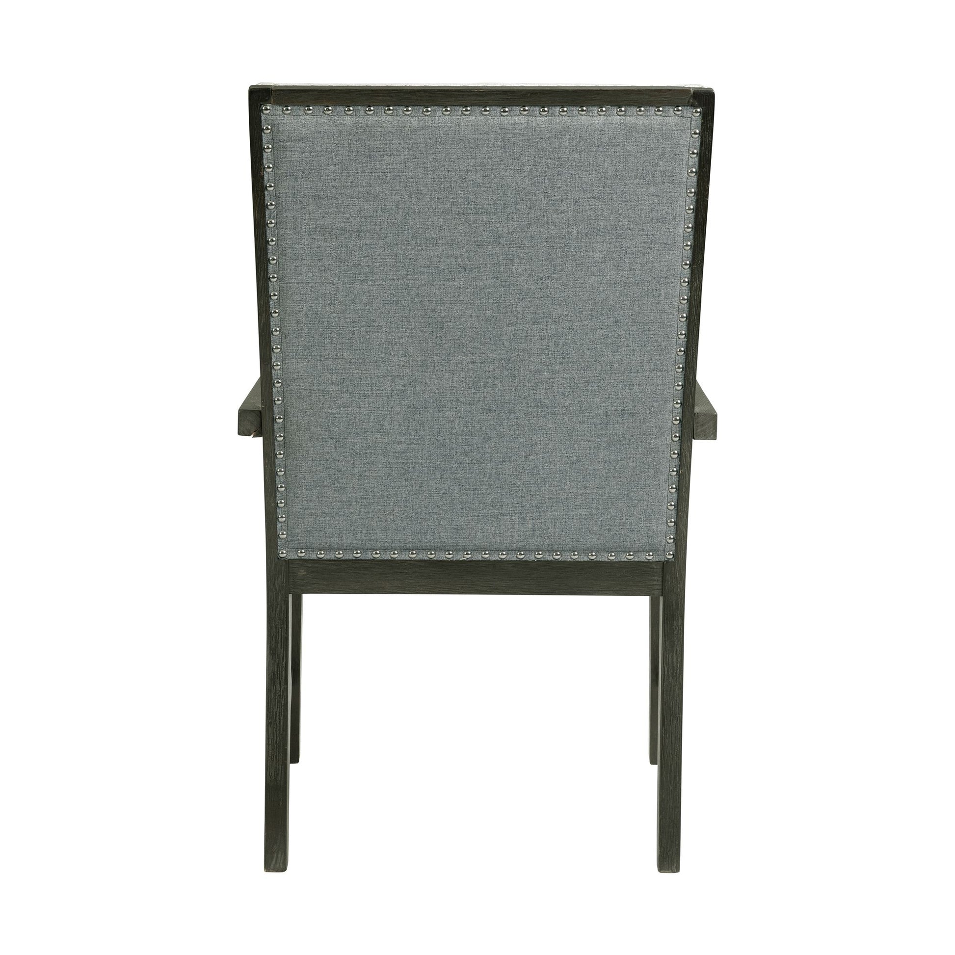 The Donovan Standard Height Arm Chair Set in going to look fantastic in your home! This set comes with two, dining room chairs. These chairs are upholstered in a gray fabric, that pairs beautifully with the black, wire brush finish on the legs and arms. Chrome nail head trim, outlines the edges of the chairs, instantly adding extra flair to this already stylish pair. The solid chair back is classic in design and will provide hours of comfort thanks to its foam cushioning. Add these stunning chairs to your dining table today for a look you'll love day after day!
