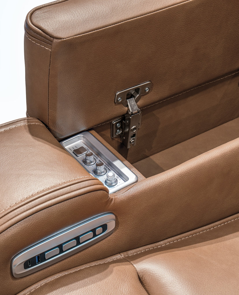 - Armrests with flip-top storage; hidden Thunder control panel with adjustable volume, bass and vibration knobs