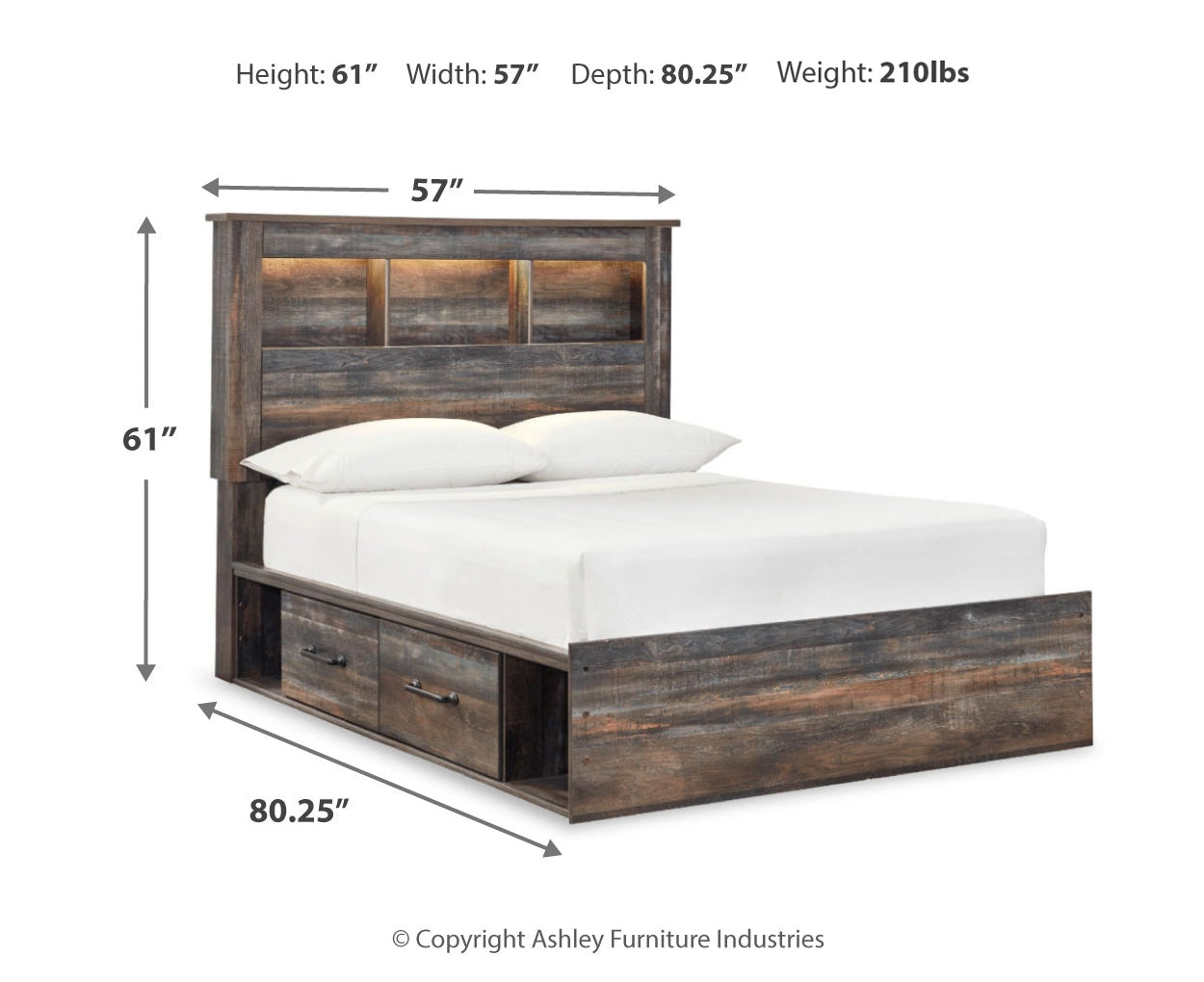 This full-size bookcase bed with storage, dresser, mirror and chest of drawers is a refined take on barn board beauty. Its complex, replicated wood grain showcases hints of burnt orange and teal tones for a sense of weatherworn authenticity. Three open cubbies lined with a dimming LED light strip keep bedtime reads top of mind while underneath the bed is four smooth-gliding drawers and four open cubbies that accommodate casually cool storage bins. The dresser and chest with smooth-gliding drawers lined with faux linen laminate and industrial dark-tone hardware complete this rustic and industrial style bedroom. Mattress and foundation/box spring available, sold separately.