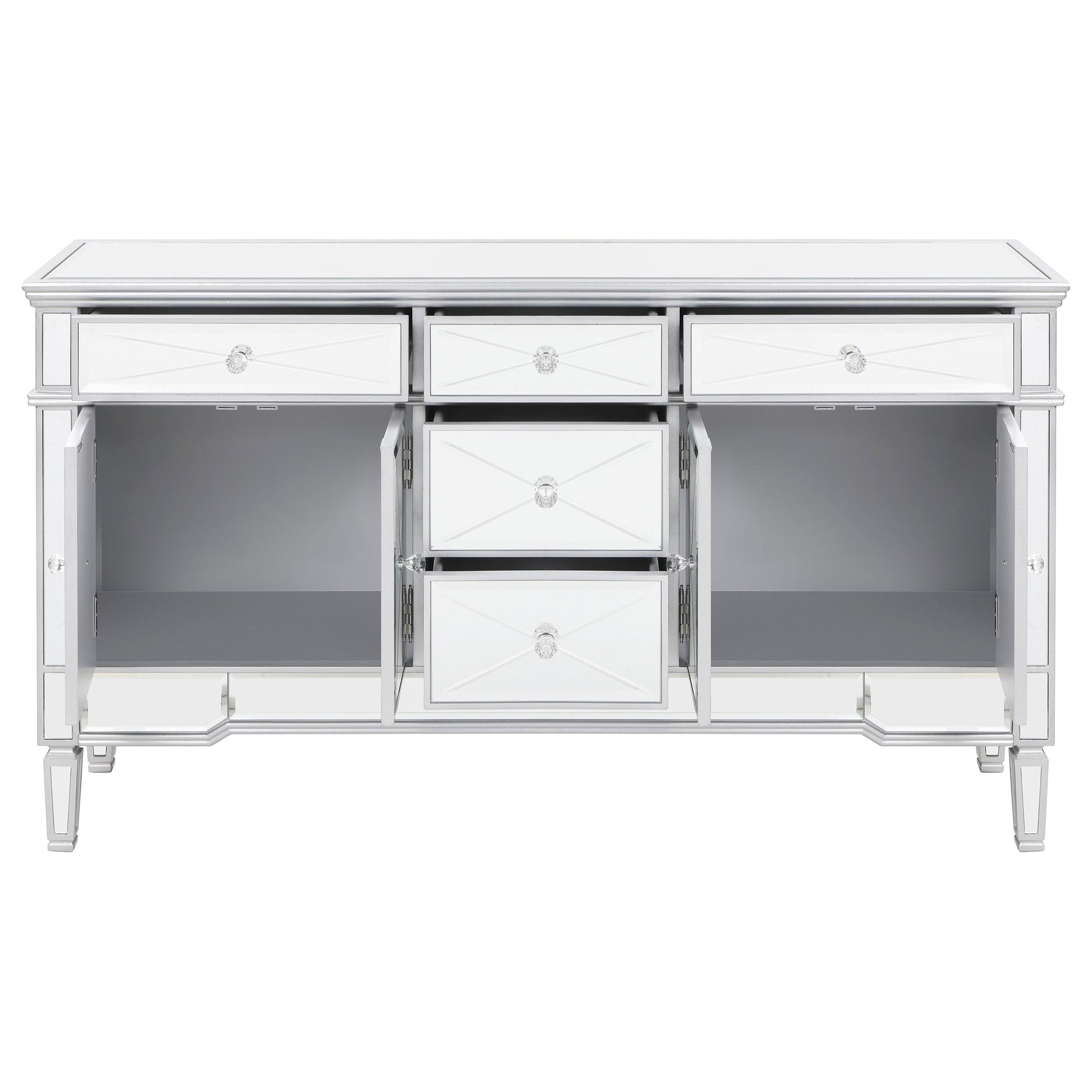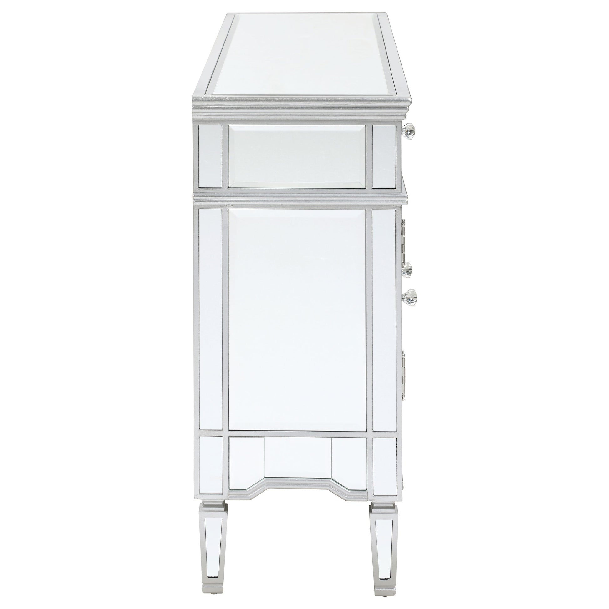 This mirrored accent cabinet has plenty of storage and panache. Fashioned from a combination of materials, it brings modern appeal and convenience to the home. It features birchwood and MDF construction in a silver finish to match the lustrous mirrored accents. Nine mirrored drawers with crystal hardware feature plenty of storage capabilities for all your needs. It's a fine addition to a modern styled living room or entertainment room.