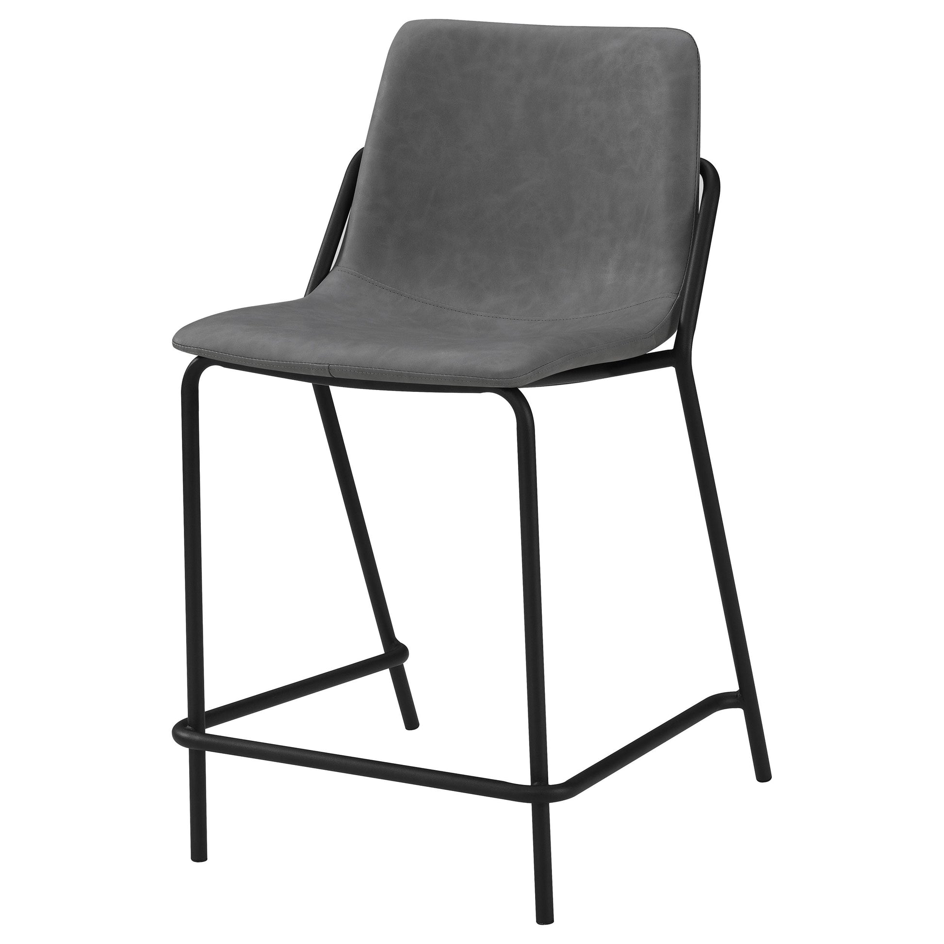 This pair of two stools offer a minimal look and a contemporary vibe. Supported by thin and tall frame in a black finish, it has an open and airy design that works with many styles. Each chair has a bucket style, Mid Century inspired seat, which is wrapped in a leatherette that is easy to clean and soft to the touch. In addition, each stool offers a supportive footrest run between the two front legs. Add a pair of these stools to a home bar for entertaining.