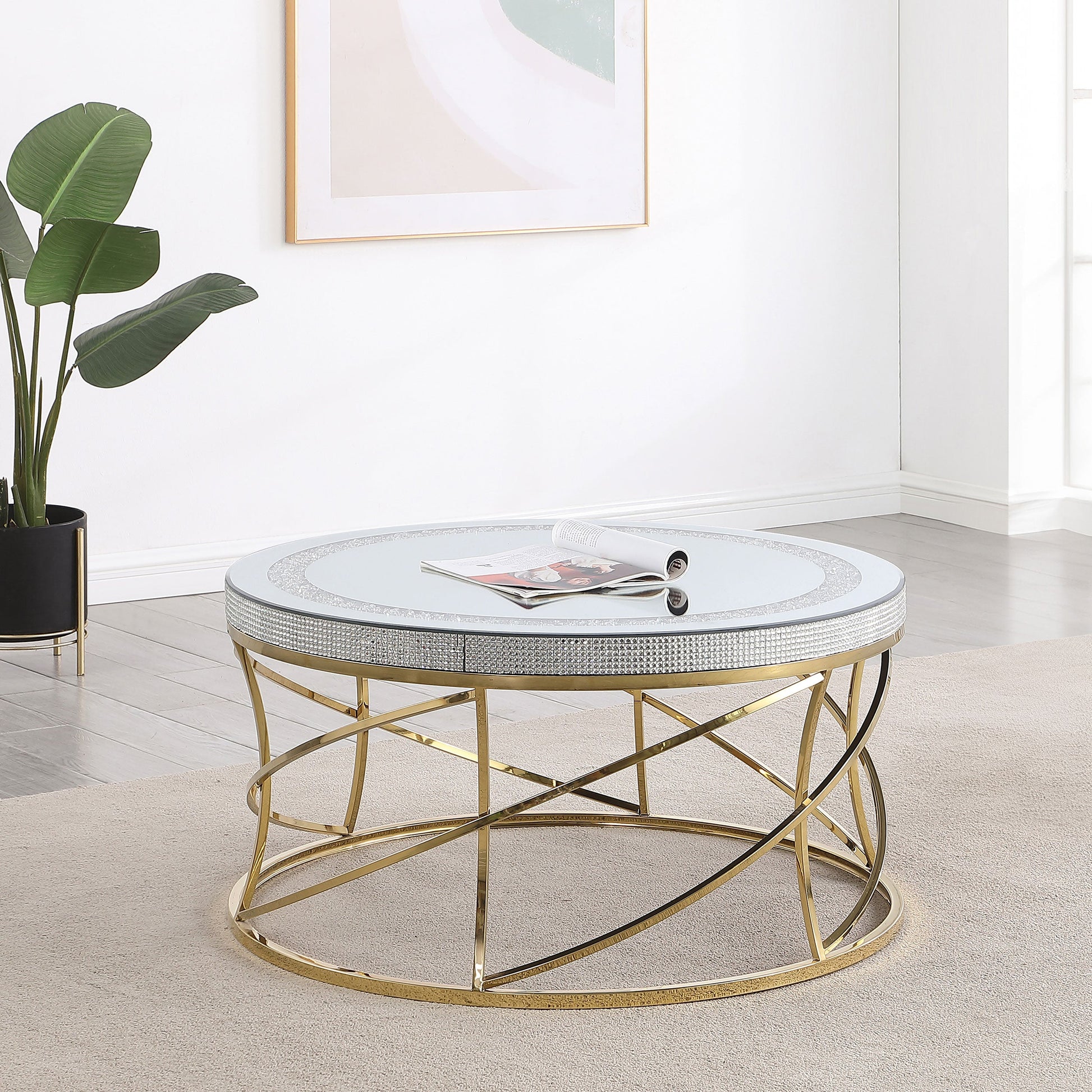 Golden spirals and spindles create a fresh sense of movement and energy in this round coffee table. The mirrored top is framed by an inset ring of acrylic crystals, creating a jewel-like effect that adds texture and depth. Acrylic crystals adorn the edge of the table, further enhancing its glamorous look. The base, crafted from stainless steel with a gold particle vapor deposition (PVD) finish, adds a dynamic flair to the piece. With its striking combination of gold and silver elements, this modern glam table brings inspired style to your living room.