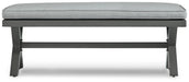 Add a distinguished touch of gray to your outdoor living space with this bench. It's made with an aluminum frame with a wood-look finish for a relaxed feel that provides seasons of enjoyment. Rest assured, the thick seat cushion is wrapped in Nuvella® high-performance fabric that’s fade-resistant, stain-resistant and a breeze to clean.| Full Dimension | 54W x 17D x 17H |
