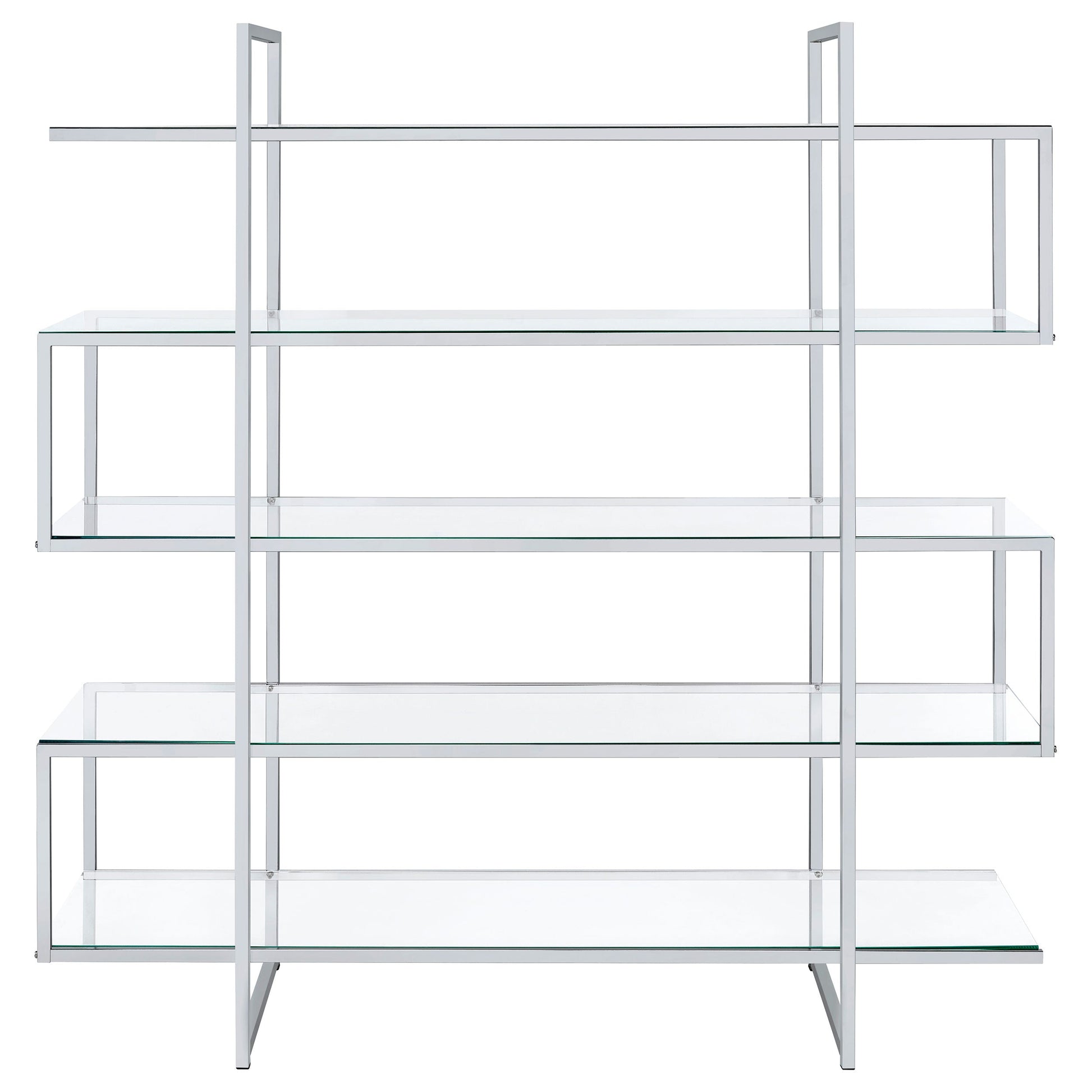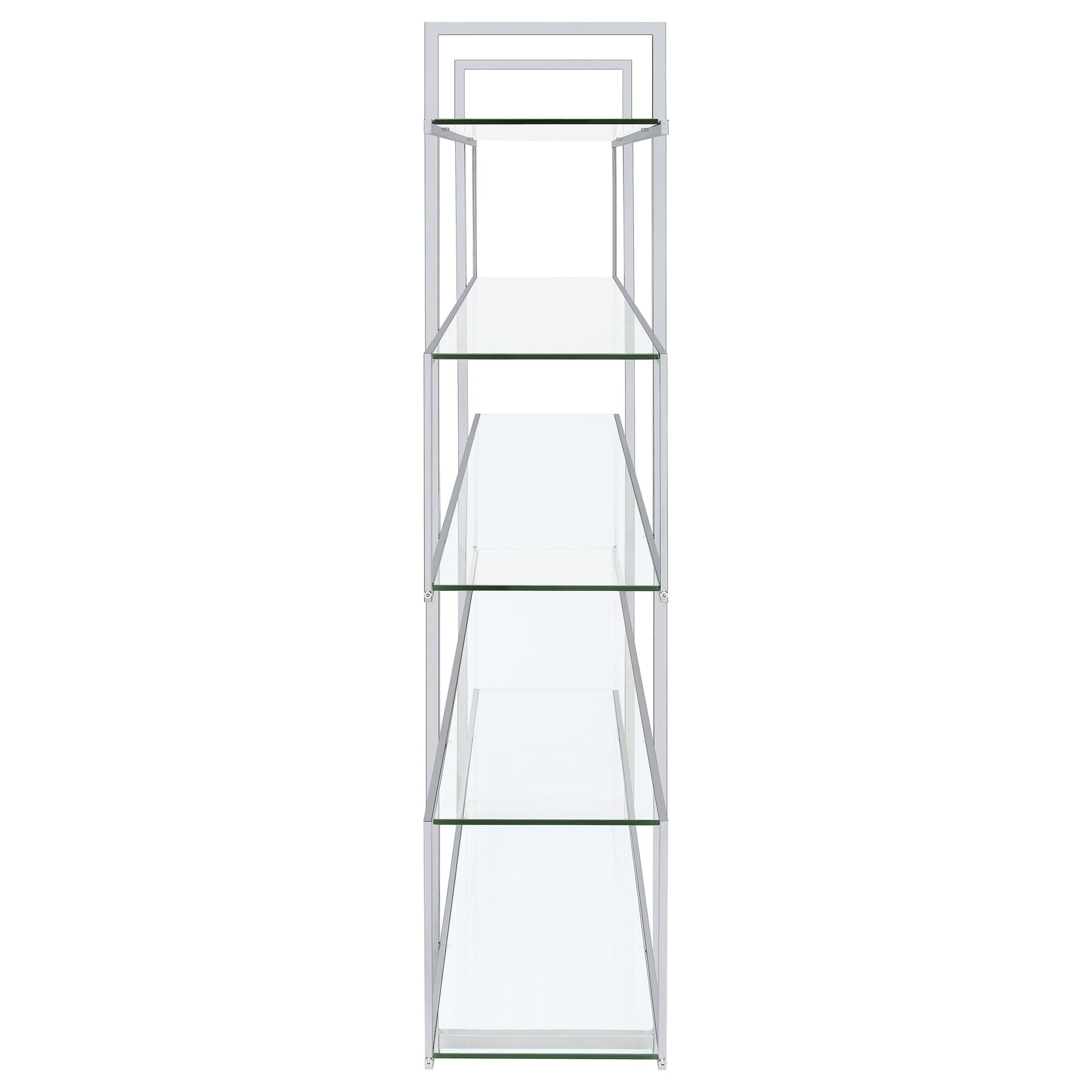 Jump on a trendy, modern bandwagon. Refresh a contemporary space with a stylish piece designed to organize and display. This four-tier bookcase offers a cool profile with personality. Tempered glass shelves blend perfectly with a steel frame. Make room for books, photos, and decor on this edgy, attitude-rich piece.