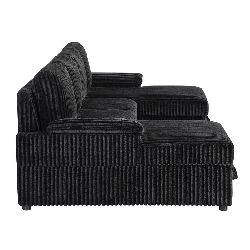Upholstered in a rich black textured fabric, the Ember sectional delivers a sleek, contemporary look while offering a soft and inviting feel. The three-piece configuration features two extended chaises, providing generous lounging space for relaxing or entertaining. A smoothly integrated pull-out bed transforms the sectional into a convenient sleeping surface, making overnight hosting effortless. Clean lines, plush cushions, and a low-profile silhouette complete the modern design.