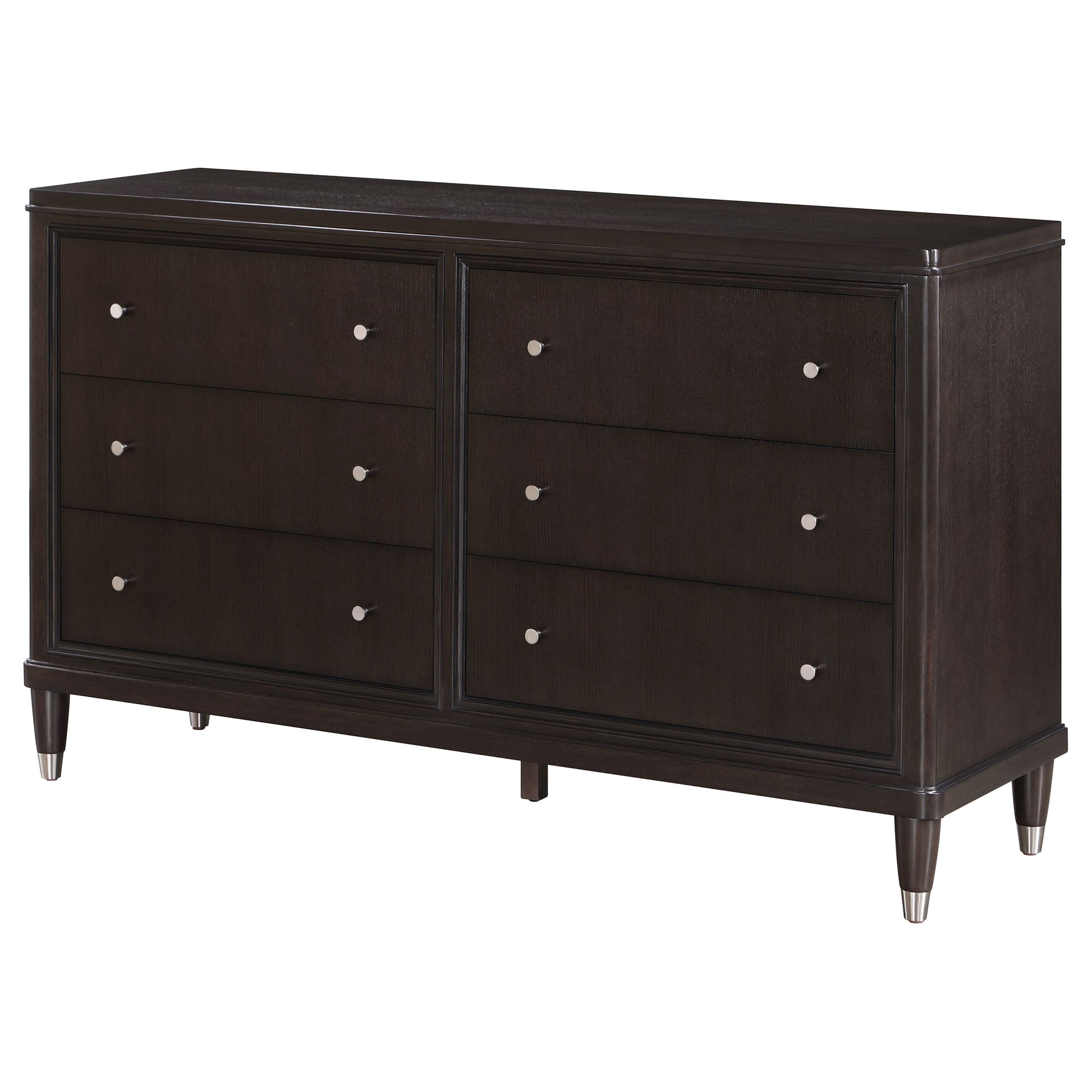 Introduce stylish storage in your bedroom with a modern six-drawer dresser. Its sleek look is accentuated in a dark brown finish, with metallic accents that add depth to tapering feel. Petite knobs decorate each drawer front as drawers offer ample storage for clothing, linens and accessories in your bedroom. The dresser offers a wide top for decor and drawers add protection with felt lining in top drawer and cedar lining and bottom drawers. Add framed photos or a metal sculptural piece to the top of the dresser to add a personal touch.