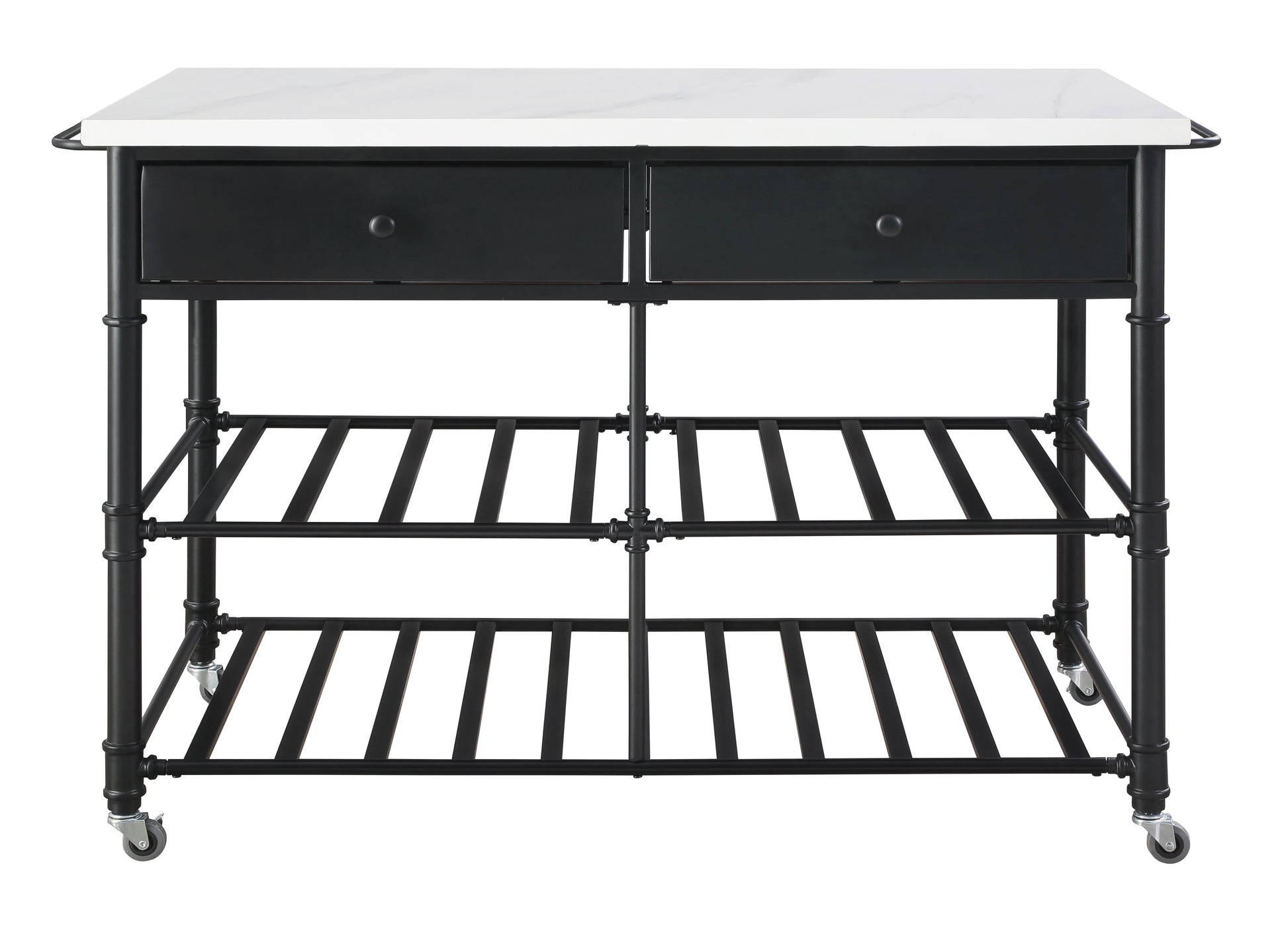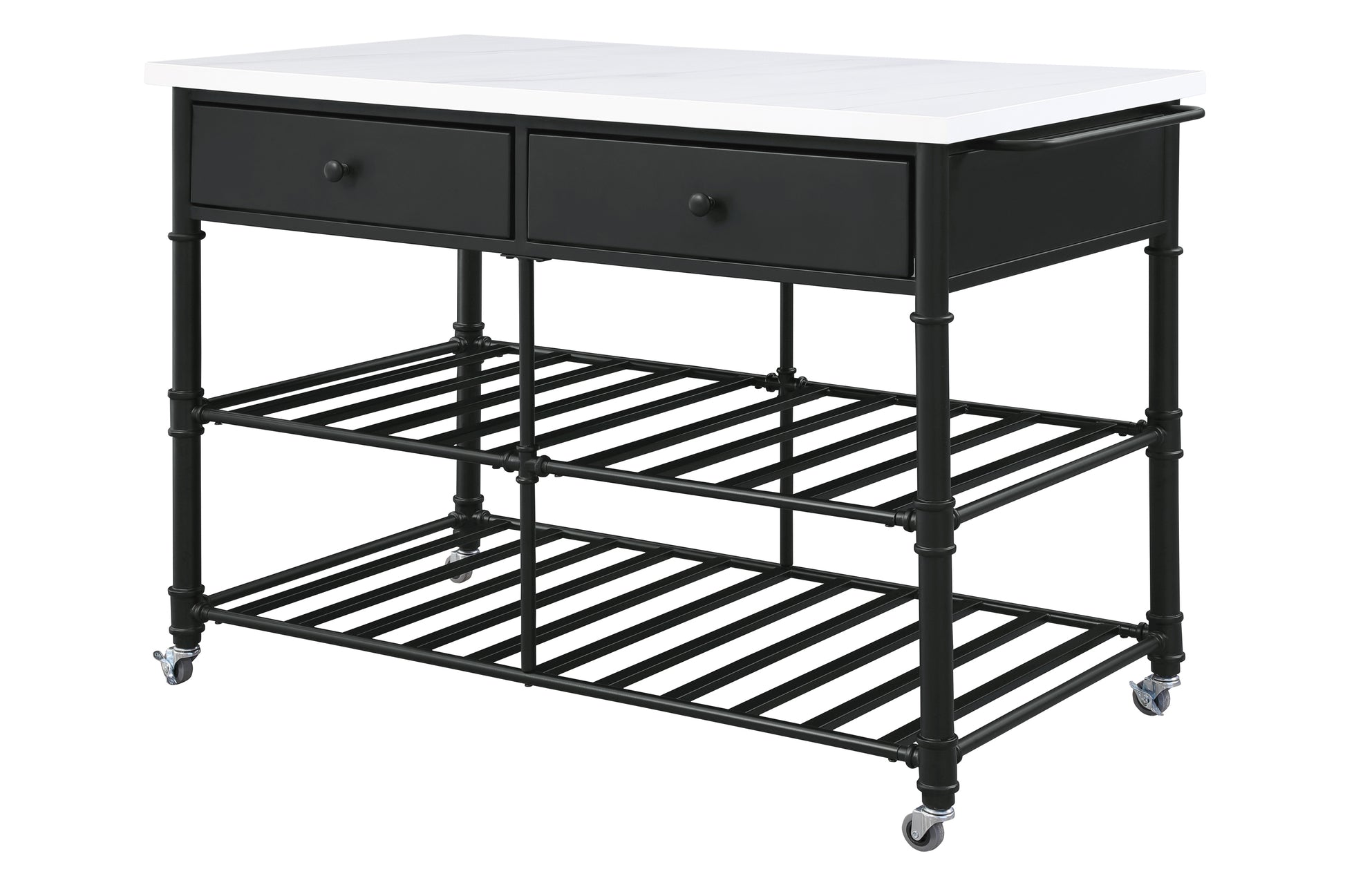Give off a light and airy feel to a compact cooking space. The Emery Kitchen Island features a artificial stone top paired with two metal slatted shelves, creating a sleek, timeless silhouette that bring your kitchen an open feel. Two storage drawers and hanging rods help you organize a variety of tools in your kitchen. Four caster wheels roll easily, providing excellent mobility to this piece. Use this stylish yet functional addition to complete your kitchen decor.