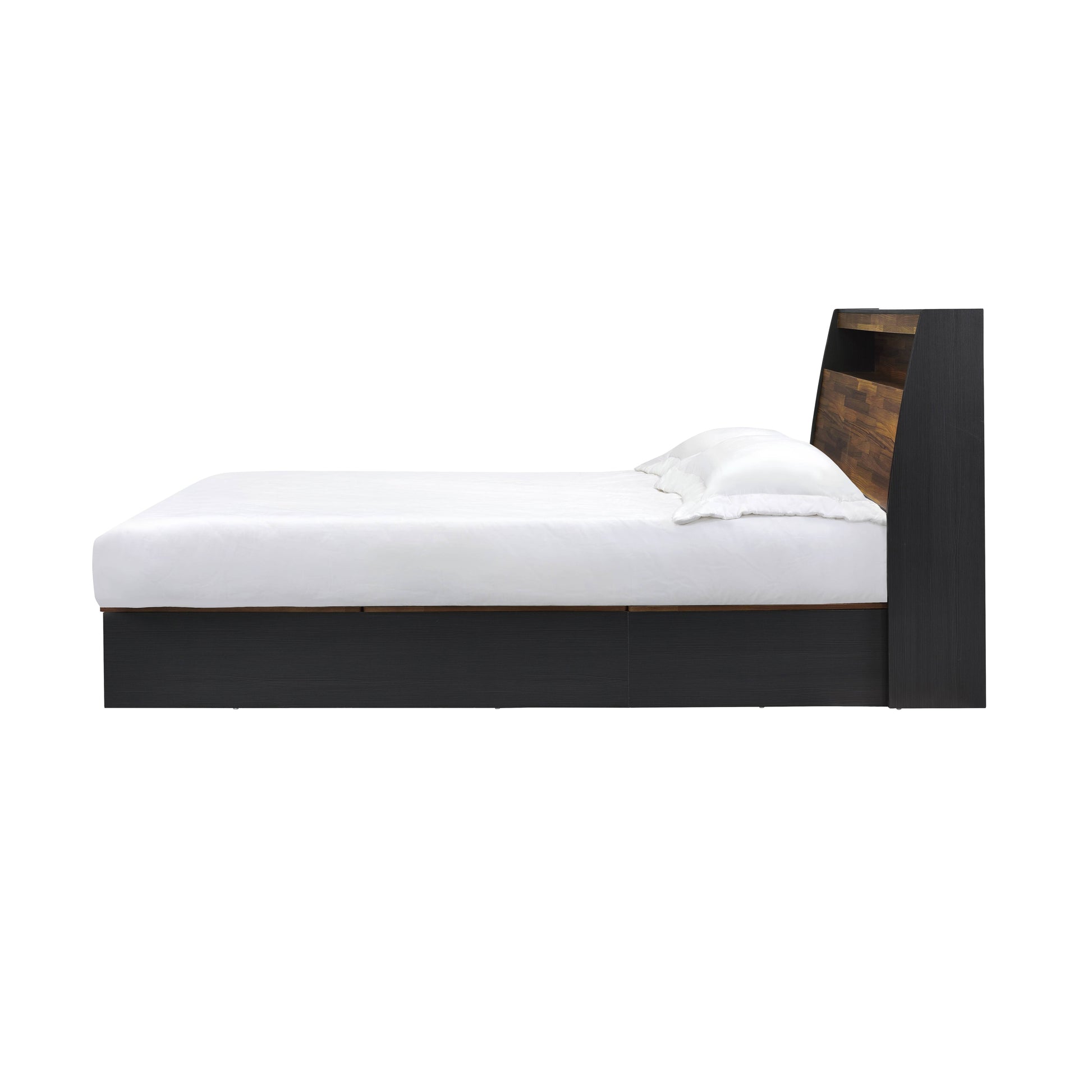 The focal point of any bedroom is a comfortable bed that invites you to unwind at the end of the day. The walnut & black finish create a perfect modern contrast and color scheme. The bed boasts a storage headboard with an open compartment for displaying decorative pieces. Adding more function to the bed, it offers a hidden storage base. Complete the look with the matching case goods that will help you stay organized.