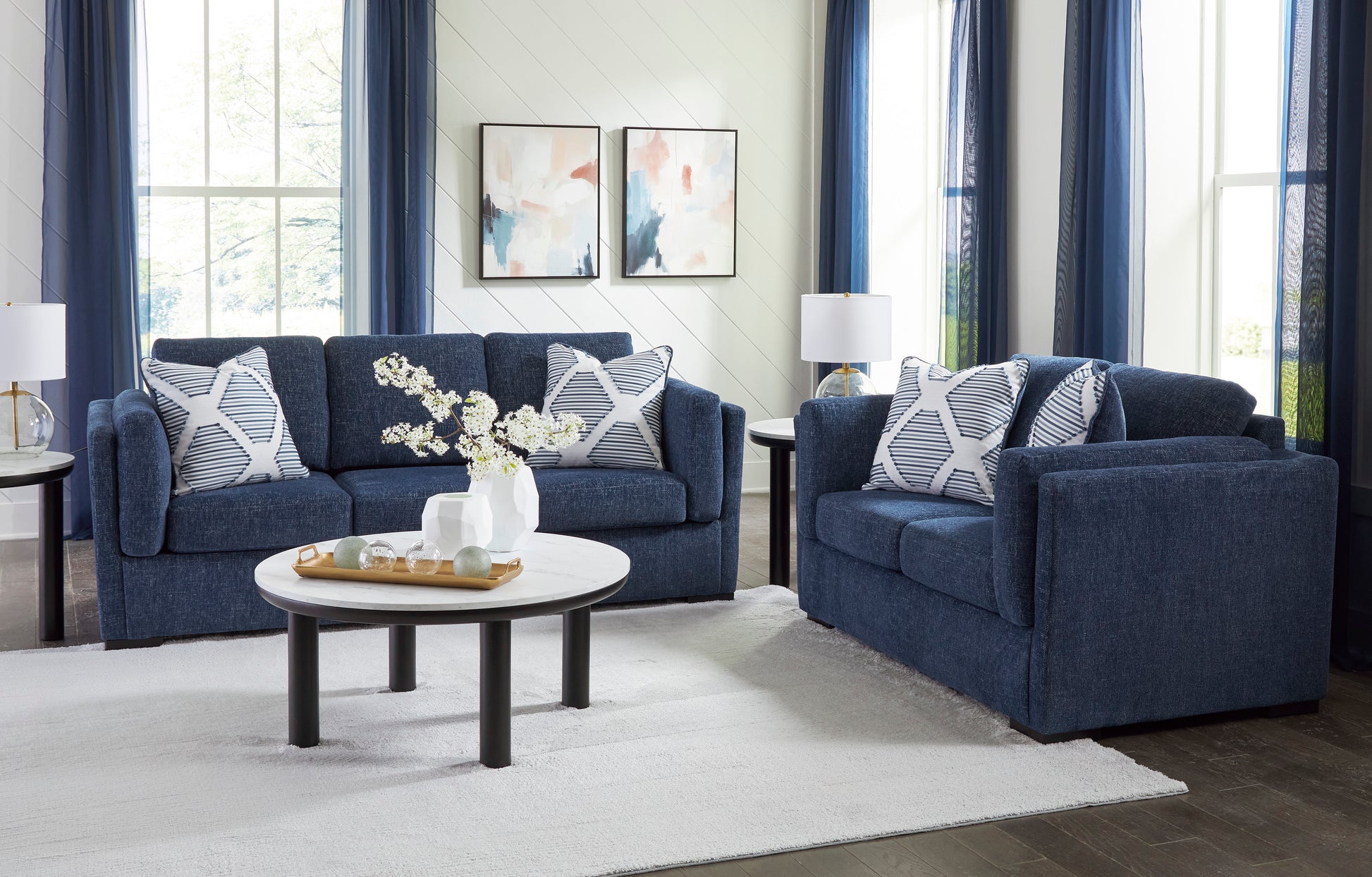 Upgrade your living space with this casual contemporary sofa and loveseat set, designed for effortless relaxation and modern appeal. Upholstered in a rich navy hue, this set keeps your home stylish while offering the perfect spot to kick back and unwind. Arm bolster pillows add extra comfort, making every lounging moment feel luxurious.