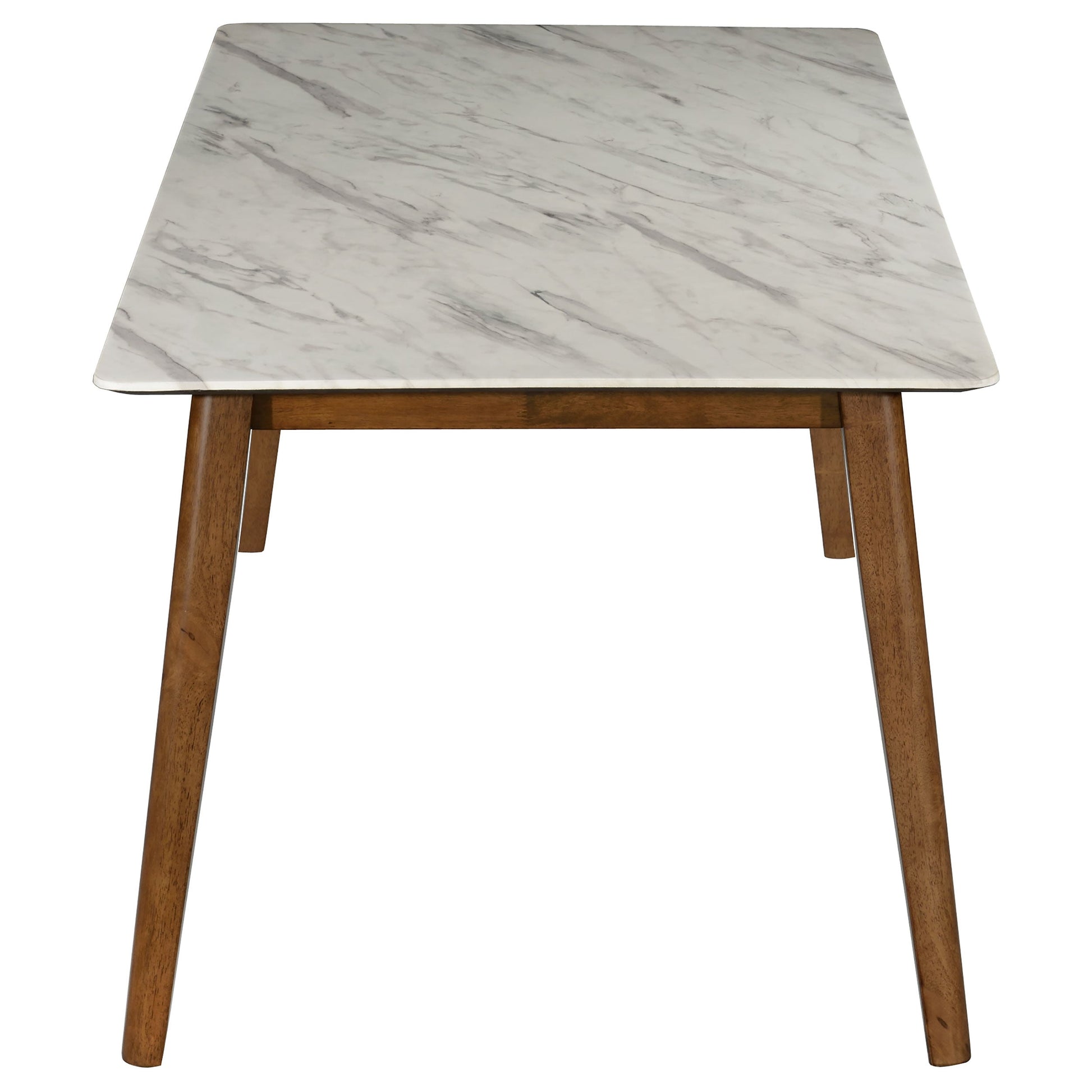 Chic, stylish, and sustainable, this wooden dining table is a smart choice for the modern home. Made with solid wood and recycled sawdust, it's an environmentally friendly choice. The white faux marble top gives it a look of modern elegance. The angled wooden legs create a striking contrast with the top for an extra touch of style. Stain, UV, weather, and abrasion resistant, this piece is the perfect choice for the active household.