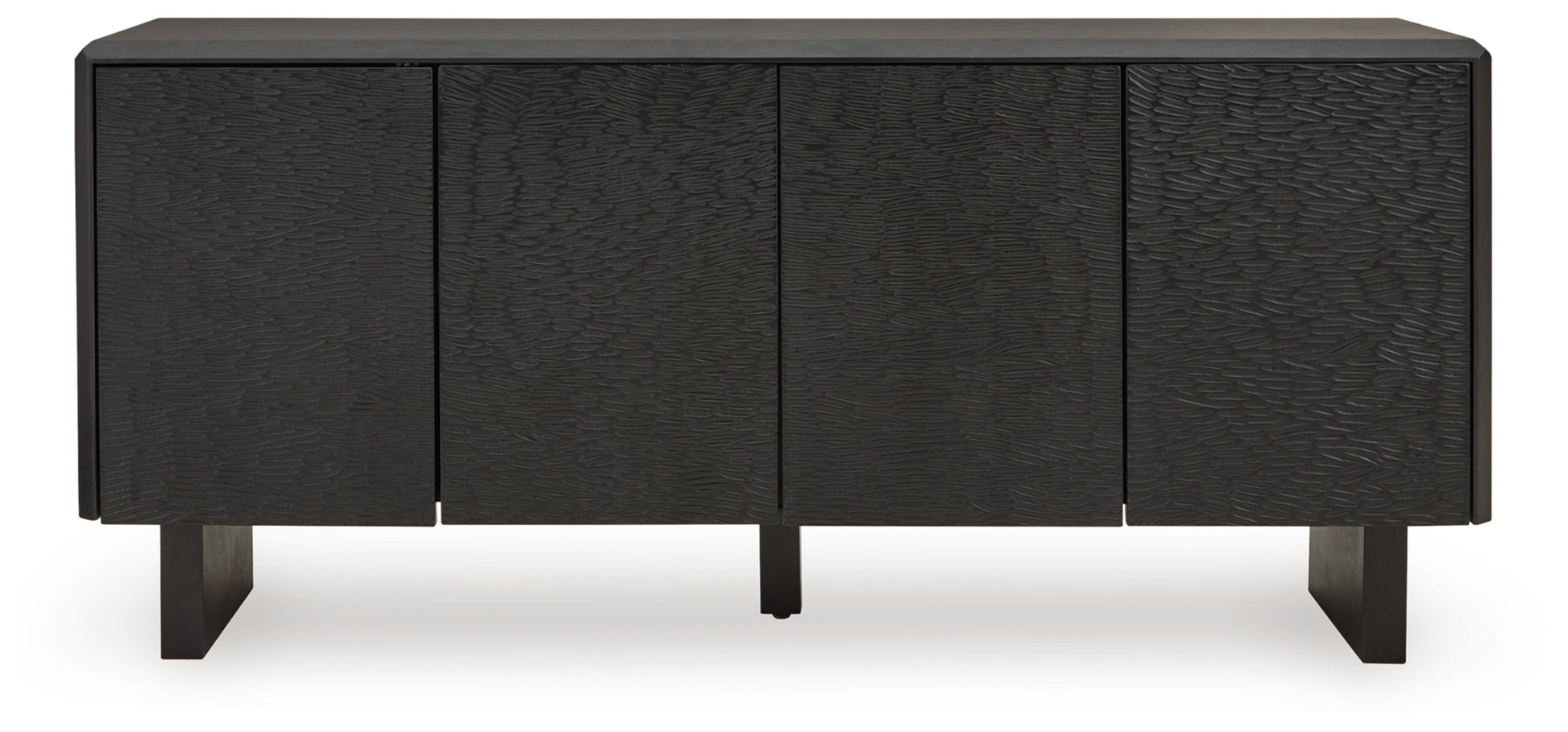 Function and style merge perfectly with this accent cabinet. Crafted of solid wood in a black finish, this piece makes a great case for fresh contemporary design. Doors with a carved pattern open to reveal shelving, while beveled edges add a distinctive touch. Whether you use it for storage or as a TV stand, your love of unique style will shine front and center.