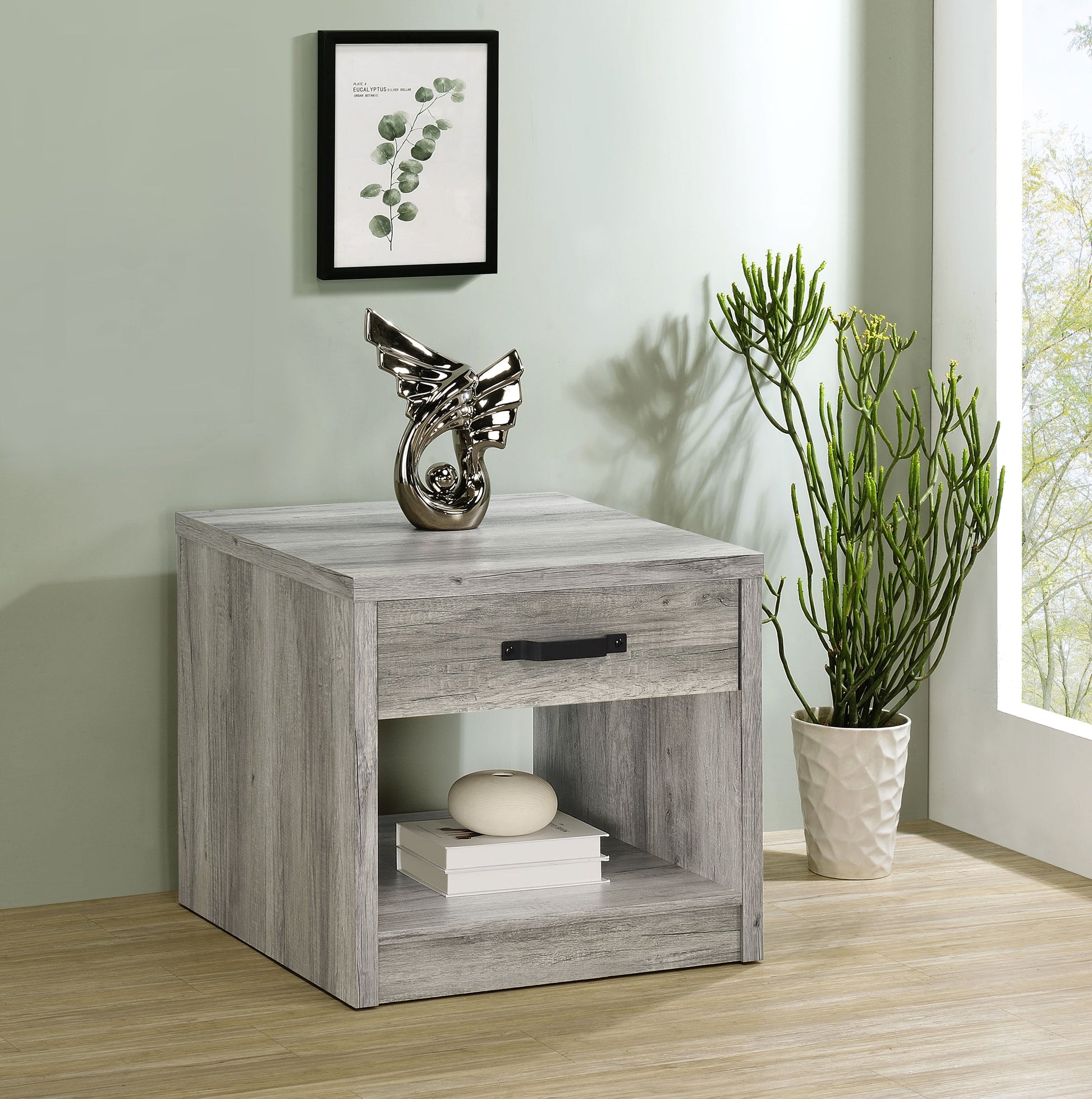 Bring rustic charm to your living room or bedroom with this versatile end table. Featuring a weathered gray finish over engineered wood and scratch-resistant veneer, it delivers a natural wood-look design. The table includes a spacious drawer with a bold black metal handle and an open shelf for additional storage or display. Its clean lines and practical design make it a perfect addition to casual and modern interiors.
