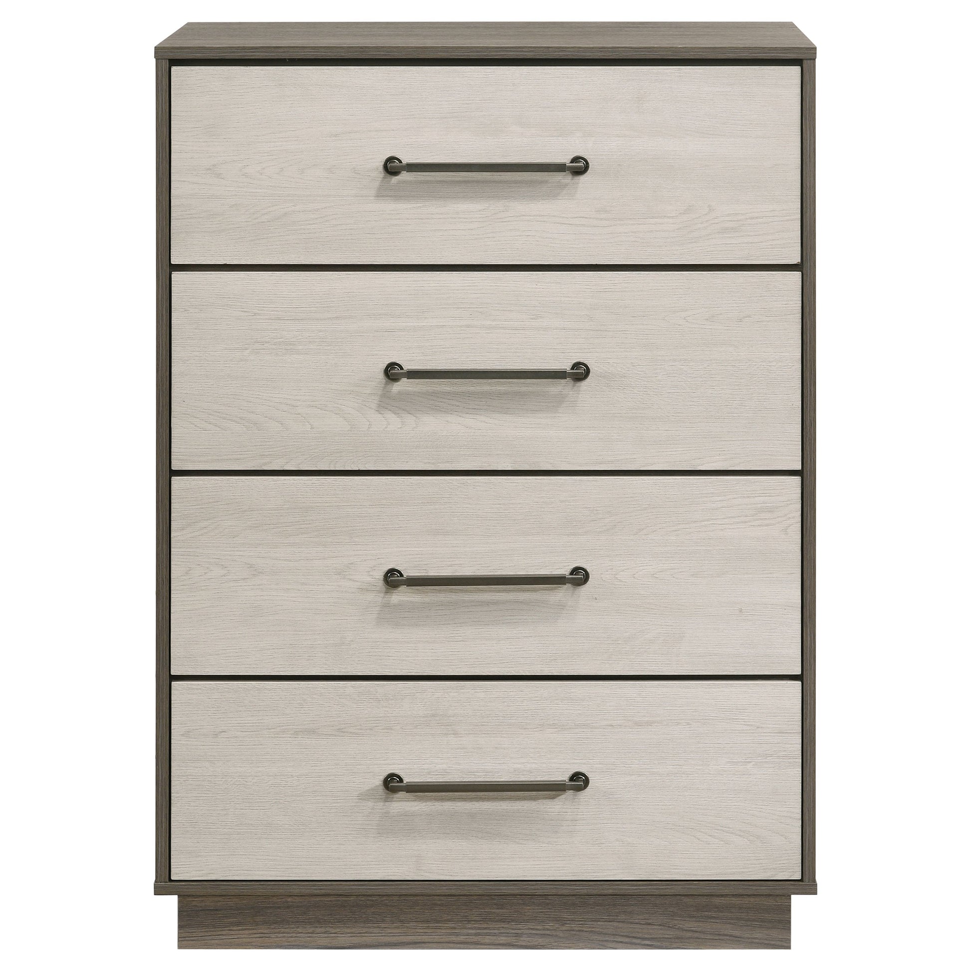 Enhance your bedroom with the elegant functionality of this four-drawer chest, designed to offer ample storage space while adding a touch of contemporary style. The sleek two-tone melamine finish blends natural wood tones, creating a modern aesthetic that complements any decor. Each drawer features smooth metal extension glides and antique nickel handles, ensuring easy access and a touch of vintage charm. The floating base design provides stability and a chic appearance, making this chest both practical and stylish. Crafted from durable melamine, particle board, and MDF, this chest is built to last, offering both beauty and functionality to your home.