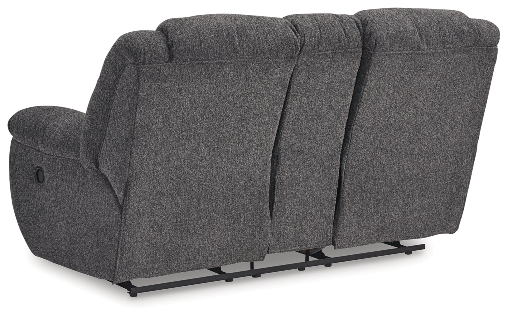 Sometimes seeing is believing. And you can rest assured that this reclining loveseat with console is every bit as indulgent as it looks. Designed to put you in the lap of luxury, the generously scaled seatingÑwrapped in a wonderfully plush and practical charcoal gray Next-Gen Nuvellaª upholsteryÑsports pillow-wrapped armrests and curvaceously cushioned head-neck support for feel-good flair.