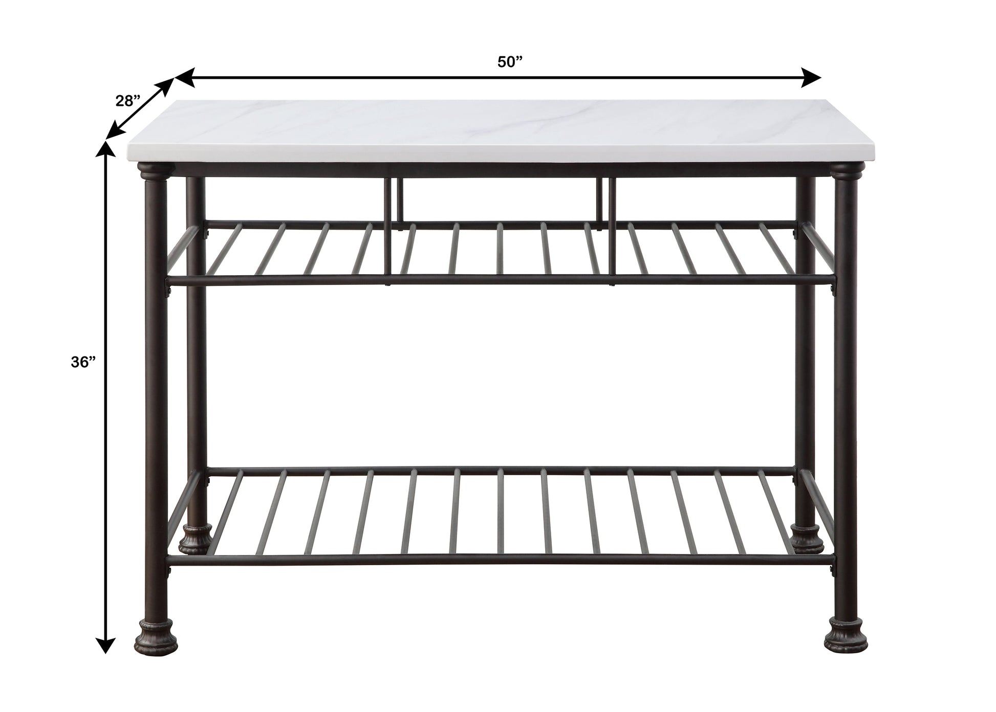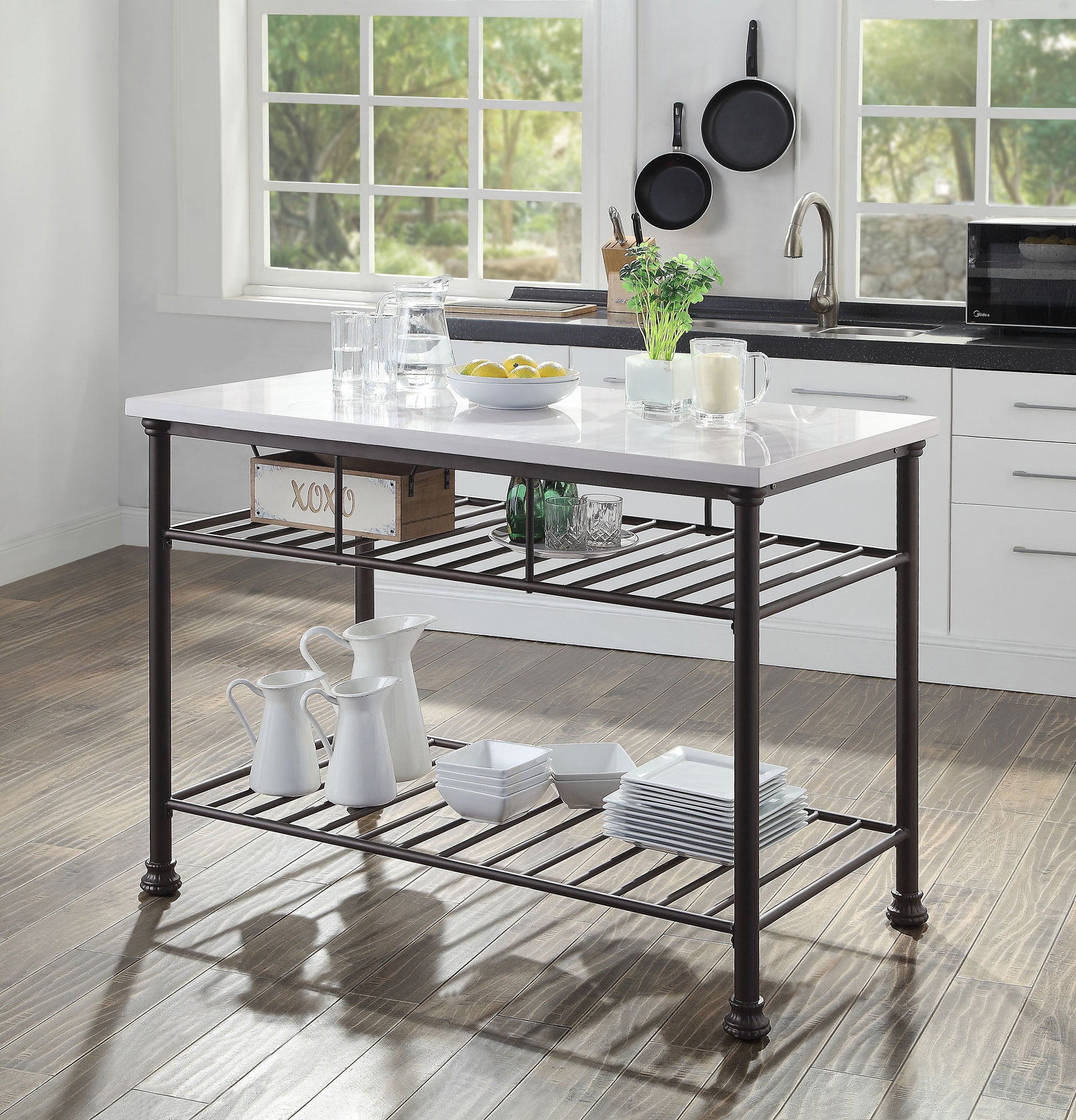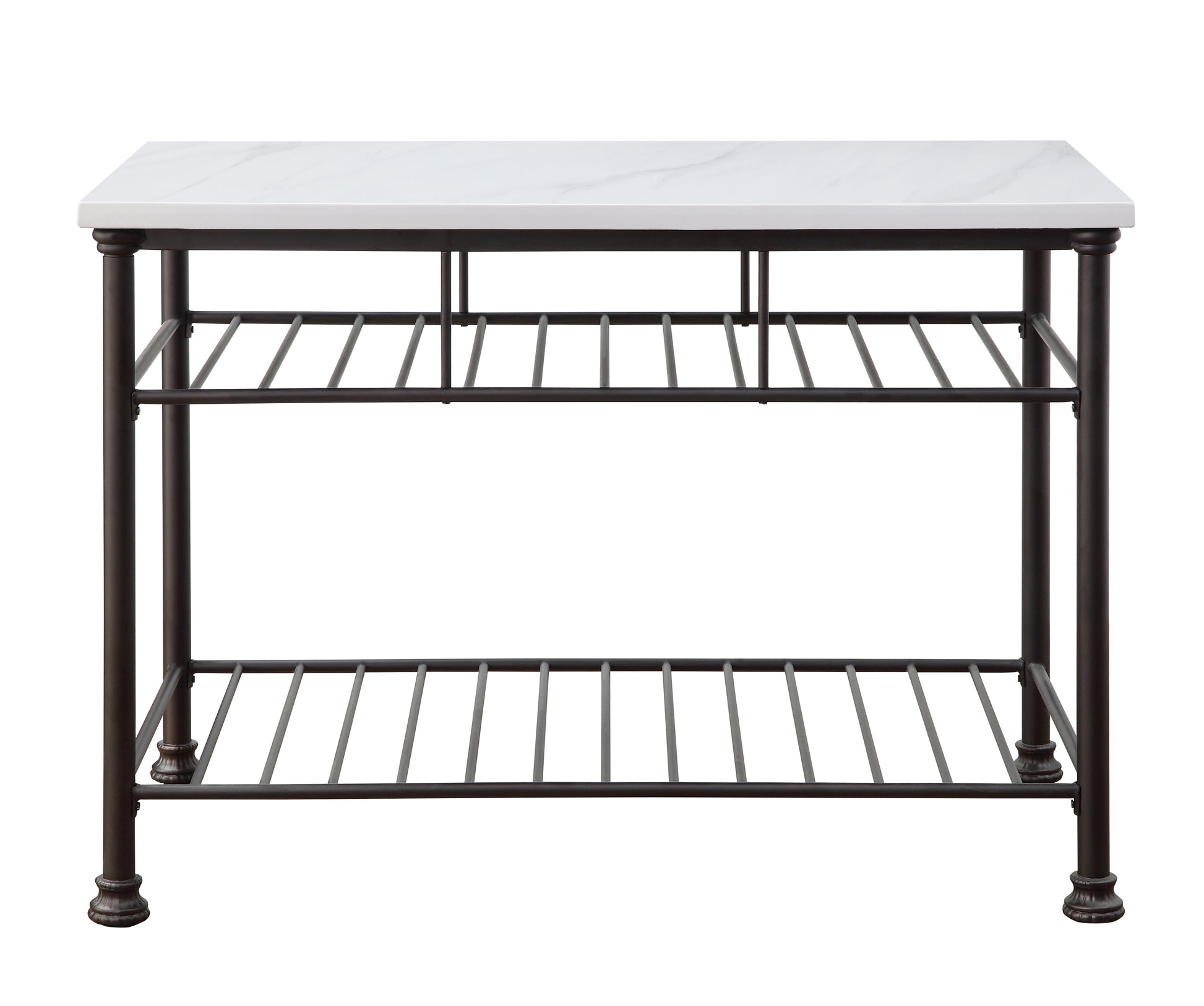 Minimalistic design paired with clean, simple color. The Freyja Kitchen Island gives off a light and airy feel to a compact cooking space. Clean-lined metal frame is topped with a artificial stone top, creating a sleek, modern silhouette that gives your kitchen an open feel. Spacious rectangular table top with two tier shelf provides more countertop space and storage. Use this stylish yet functional addition to complete your kitchen decor.