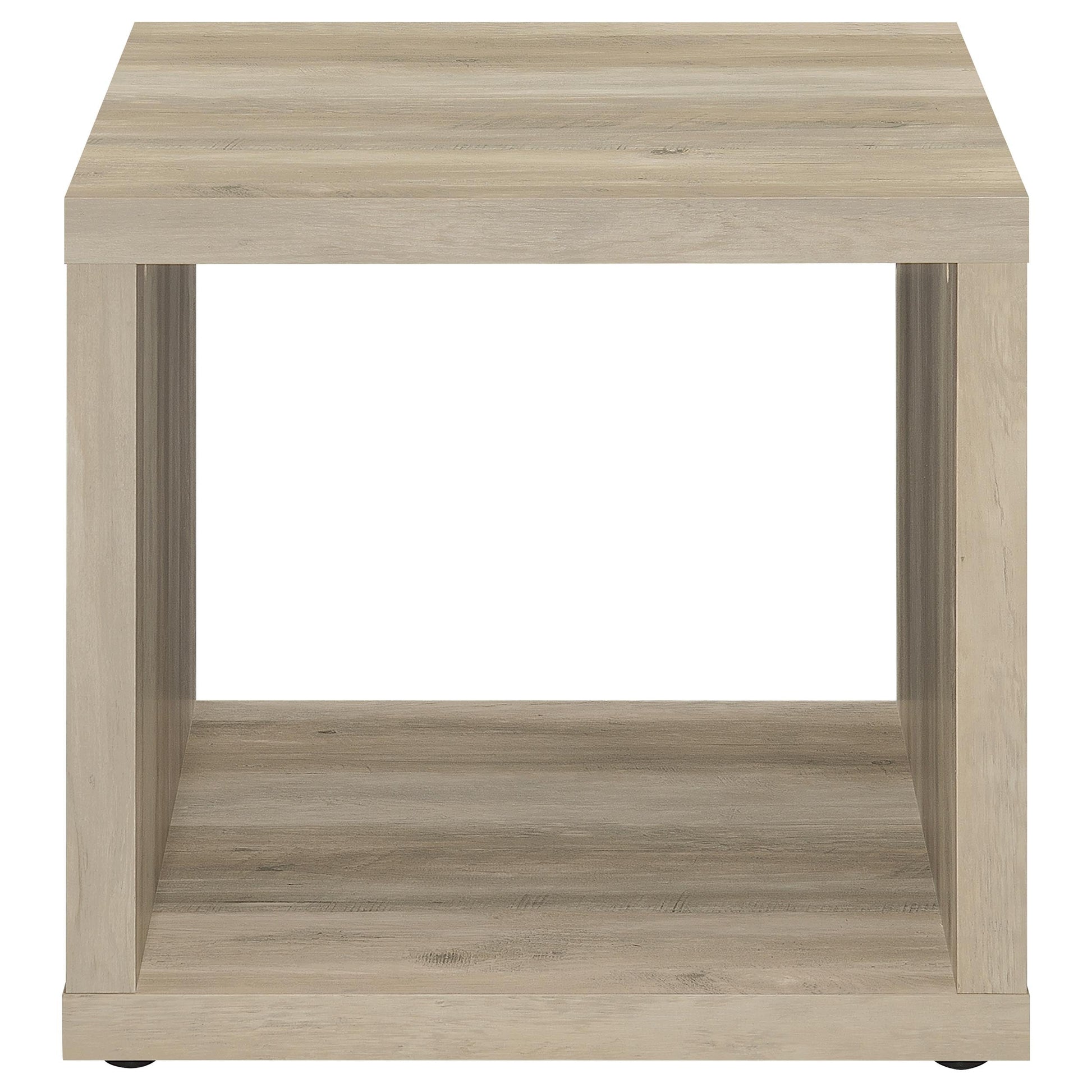 This end table blends a simple cubic silhouette with rustic charm, perfect for farmhouse or modern living rooms. Crafted from durable engineered wood, it features a wood-look finish that enhances its earthy aesthetic. An open design with a lower shelf offers practical storage or display space for decor, books, or baskets. Its compact size and versatile style make it an ideal addition to any living space, balancing functionality and warm character seamlessly.