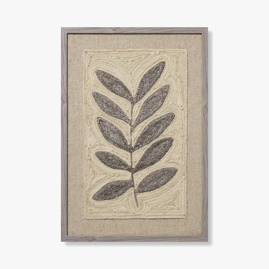 Frond & Fog is a handmade wall art piece with a grey-and-ivory botanical design, a wonderfully textural accent for bohemian or natural home decor. The artwork is crafted in India from wool and custom-framed by Loloi in the USA, measuring 26" x 38".