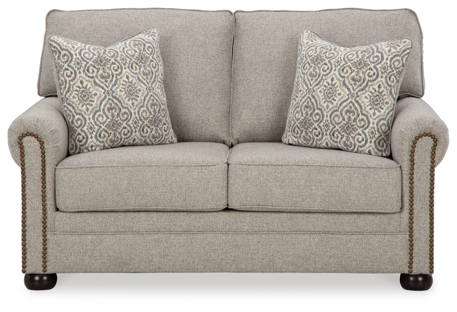Inspired by the past but rooted firmly in the present, this loveseat complements your transitional seating area. Its versatile upholstery is delightfully detailed for a subtle herringbone effect. Designer touches like decorative nailhead trim and bun legs add traditional character. With this loveseat's reliable style and comfort, all you need to do is sit back and relax.