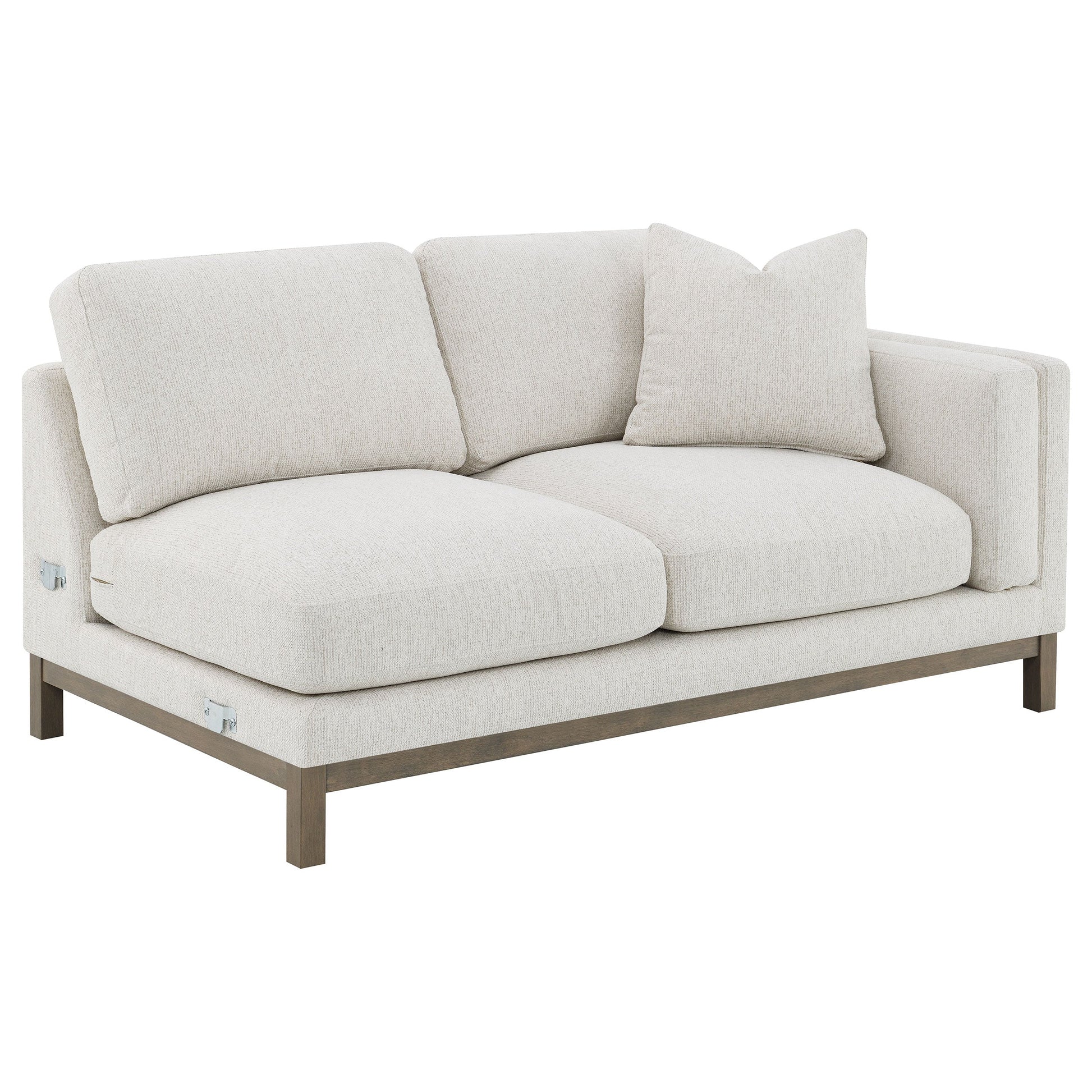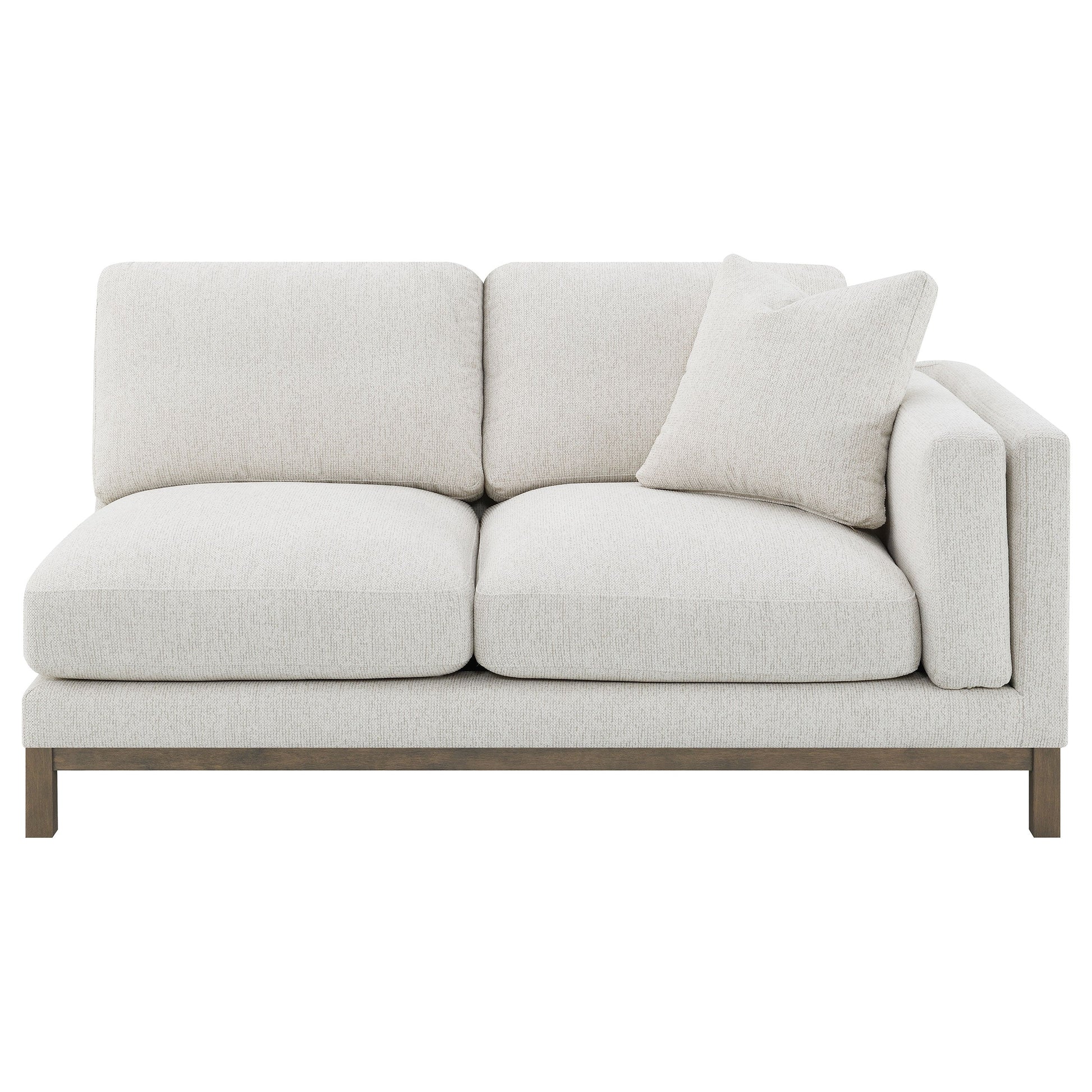 Indulge in the inviting comfort of this modern sectional sofa, thoughtfully designed with a left side chaise to accommodate your personal lounging preferences. Upholstered in a soft, textured bouclé fabric, complemented with a solid wood pedestal base in ash brown, creating the perfect stylish seating foundation. Fulling encased engineered wood frame, sinuous spring seating and foam combined with premium blend fill create a plush, resilient feel. Complete with reversible back cushions, reversible single cushions, removeable chaise cushion and coordinating accent pillows, this sectional becomes the stylish focal point of a welcoming, contemporary living room.
