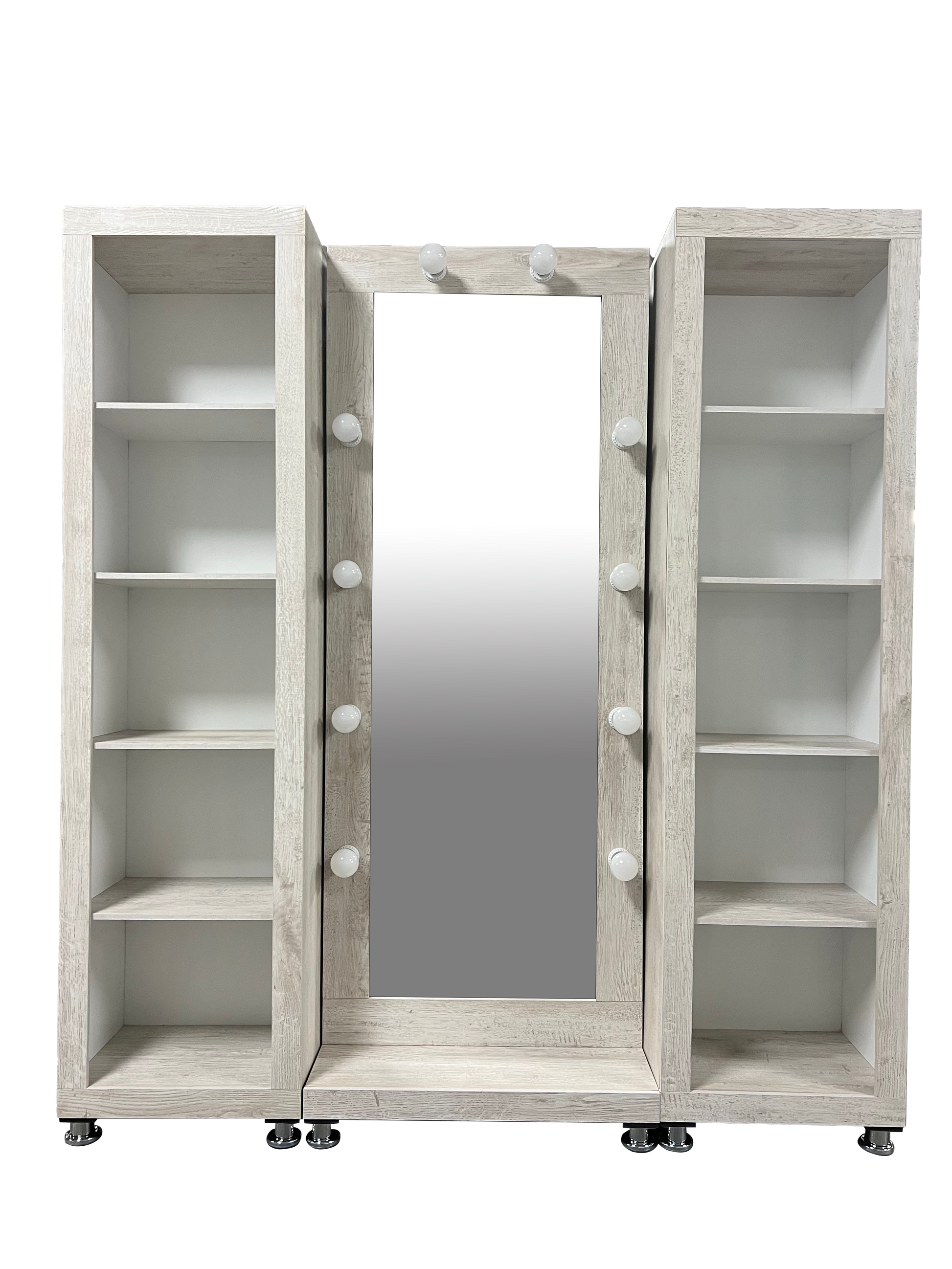 Looking for a way to maximize space and style to any room ? The Giorgina Mirror set will bring just that with its build in shelves, modern style and clean look. It has plenty of room to keep your essentials organized or just simply for any decorations to be on display!