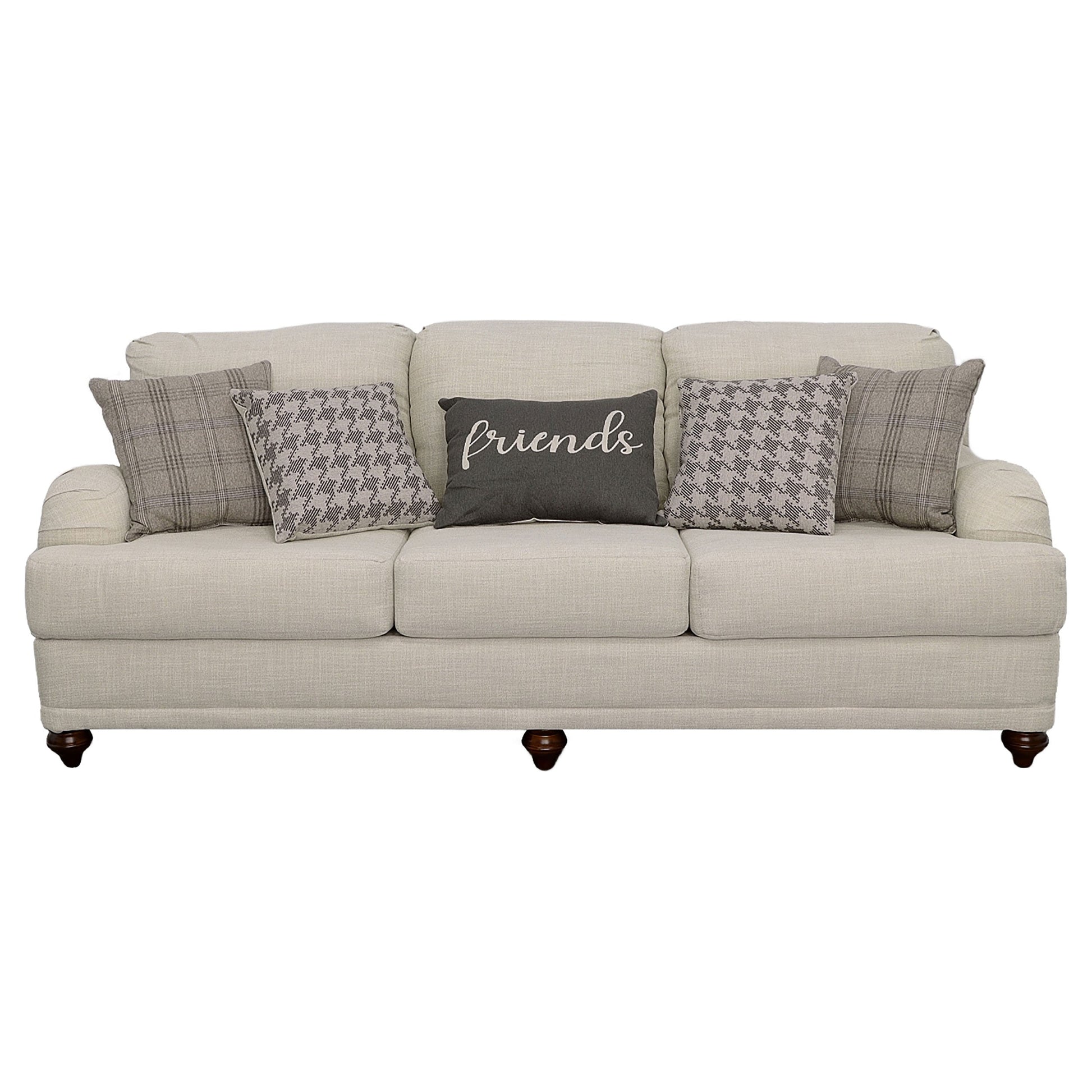 Farmhouse inspiration delivers a fresh, stylish look to a transitional space with this exceptional sofa. With tailored English arms and turned legs offering a contrasting espresso finish, this sofa shines with a light grey linen-like upholstered cover. Three reversible cushions with T-cushions on each end create comfort and stay in shape, as a solid wood frame with a sinuous spring deck sets the stage for durability. Attached back cushions remain stationary to prevent shifting. Enjoy the designer look of five accent pillows with varying blue print covers.