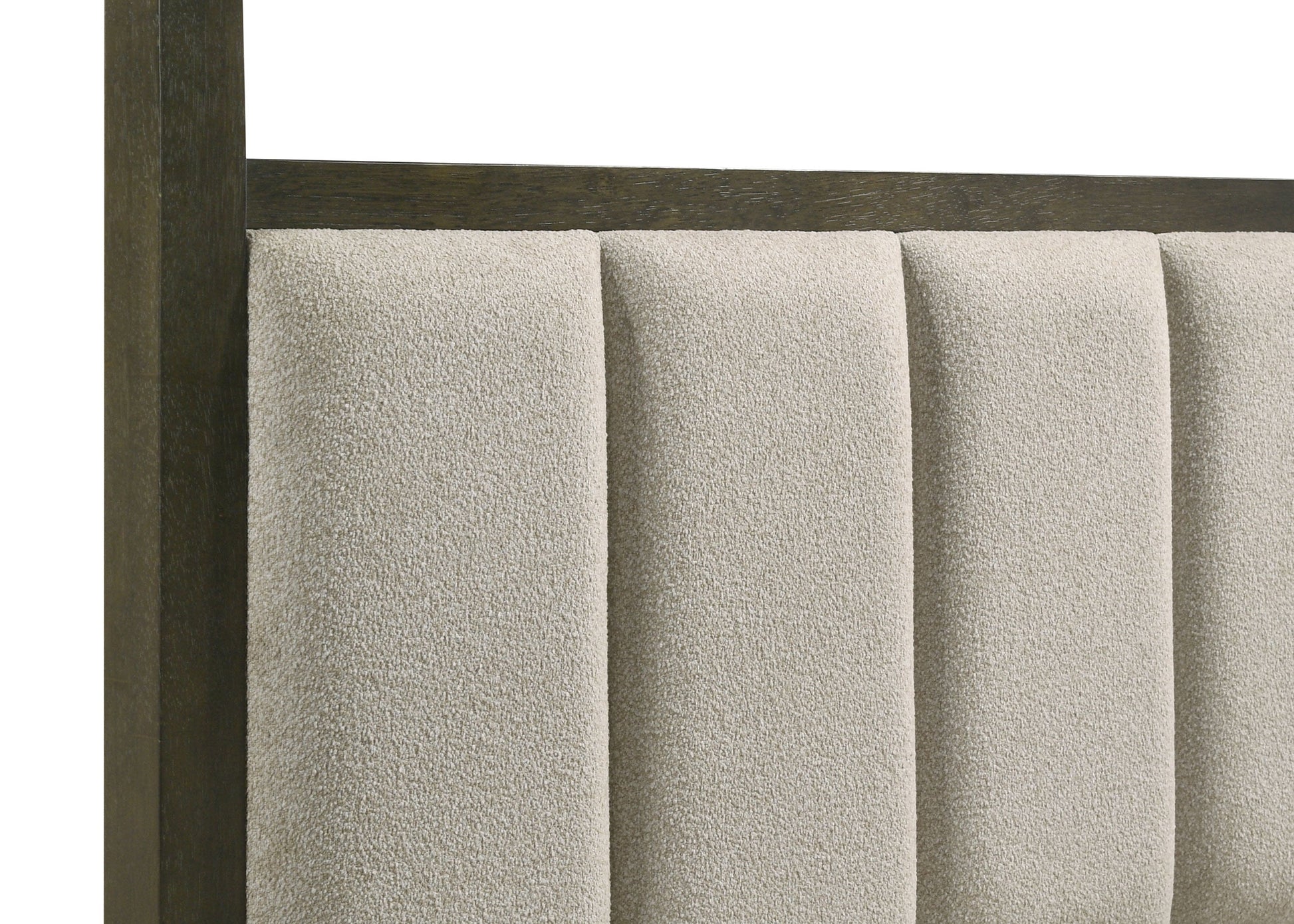 Transform your bedroom into a sophisticated retreat with this transitional canopy bed. Featuring rounded corners and trending design details, this bed offers a perfect blend of style and stability. The headboard is upholstered in textured beige fabric with vertical channeling, adding a touch of elegance. Finished in dark cocoa, the bed is crafted from solid hardwood and ash veneer, ensuring durability and a timeless look. Enjoy the luxurious feel and refined aesthetic of this beautifully designed canopy bed.