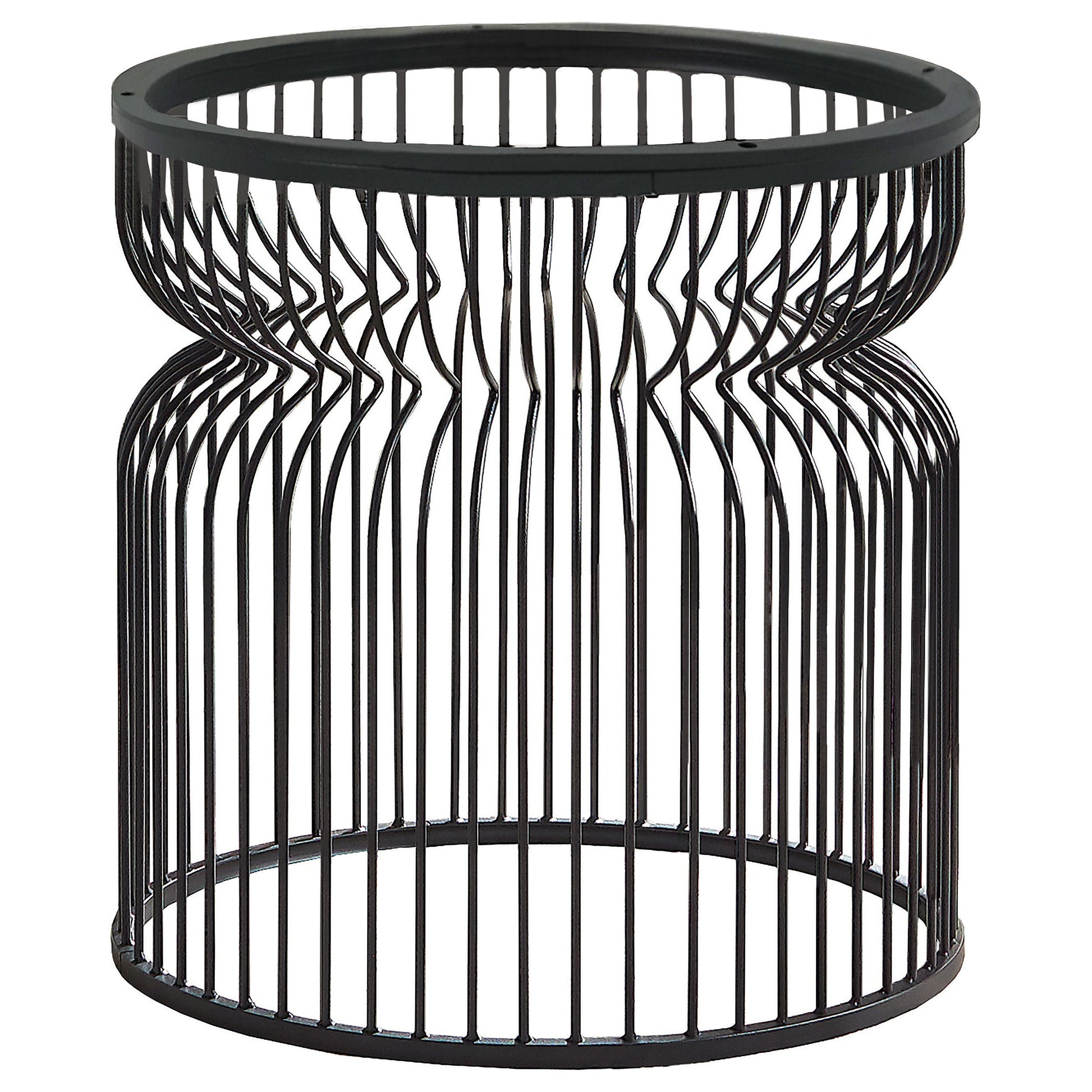 Versatile and stylish, this sculptural-like dining table features a stunning cage-style design. Round in shape with sleek, thin metal rods all around, it has a pinched top section that lends a softly curved edges and a supportive open base that sits flush to the floor. Made entirely of metal, this contemporary table base offers a dark gunmetal finish that can blend easily with existing colors and decor. In addition, this table base allows you to customize your table's size, choosing from large beveled clear glass or even marble. Create the exact table you need!