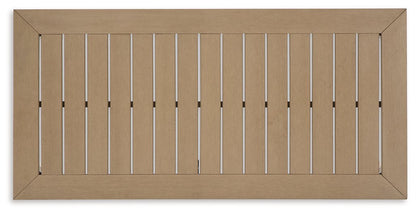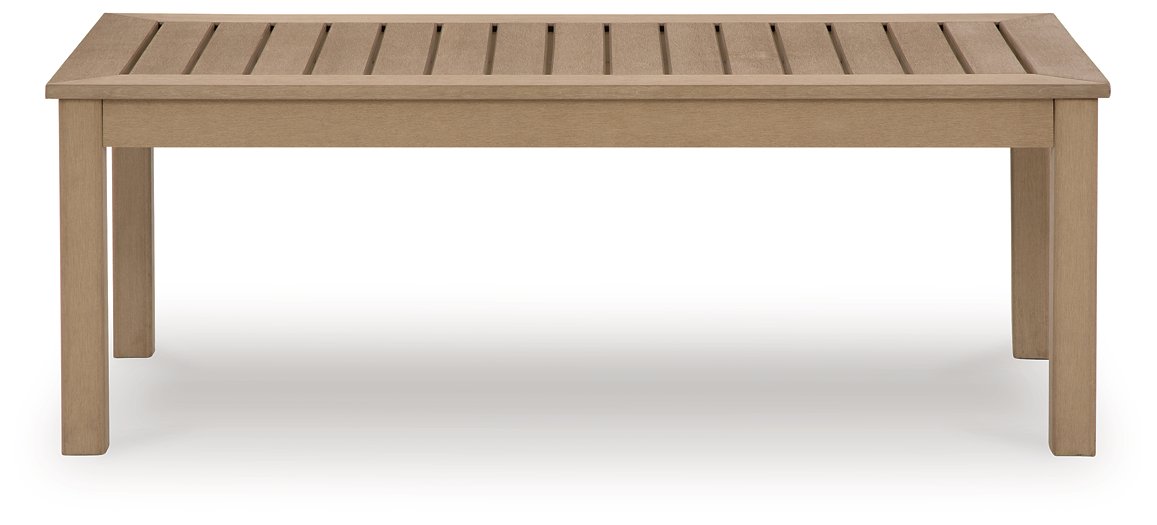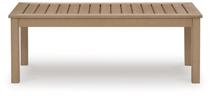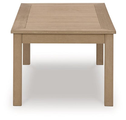 This coffee table is a beautiful addition to any outdoor living space. Effortless in its simplicity, this piece echoes your easygoing sensibilities. Combining durable, cutting-edge engineered materials, its Weatherwood construction in a blond wood color enhances the contemporary design. Pair this table with the matching sofa and chairs for a spectacular backyard or patio seating arrangement.| Full Dimension | 49W x 24D x 18H |