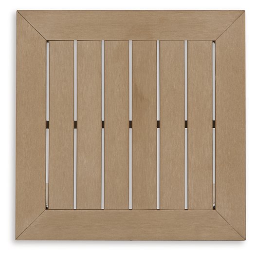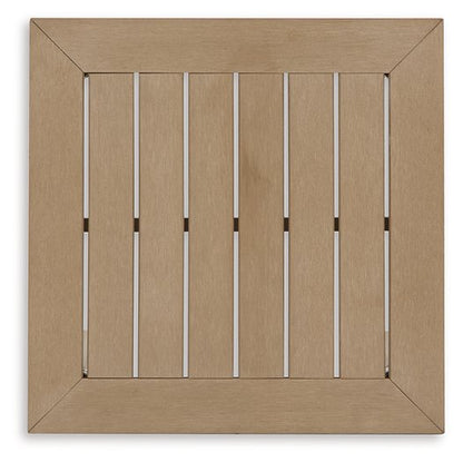 This end table is a beautiful addition to any outdoor living space. Effortless in its simplicity, this piece echoes your easygoing sensibilities. Combining durable, cutting-edge engineered materials, its Weatherwood construction in a blond wood color enhances the contemporary design. Pair this table with the matching sofa and chairs for a spectacular backyard or patio seating arrangement.| Full Dimension | 24W x 24D x 24H |