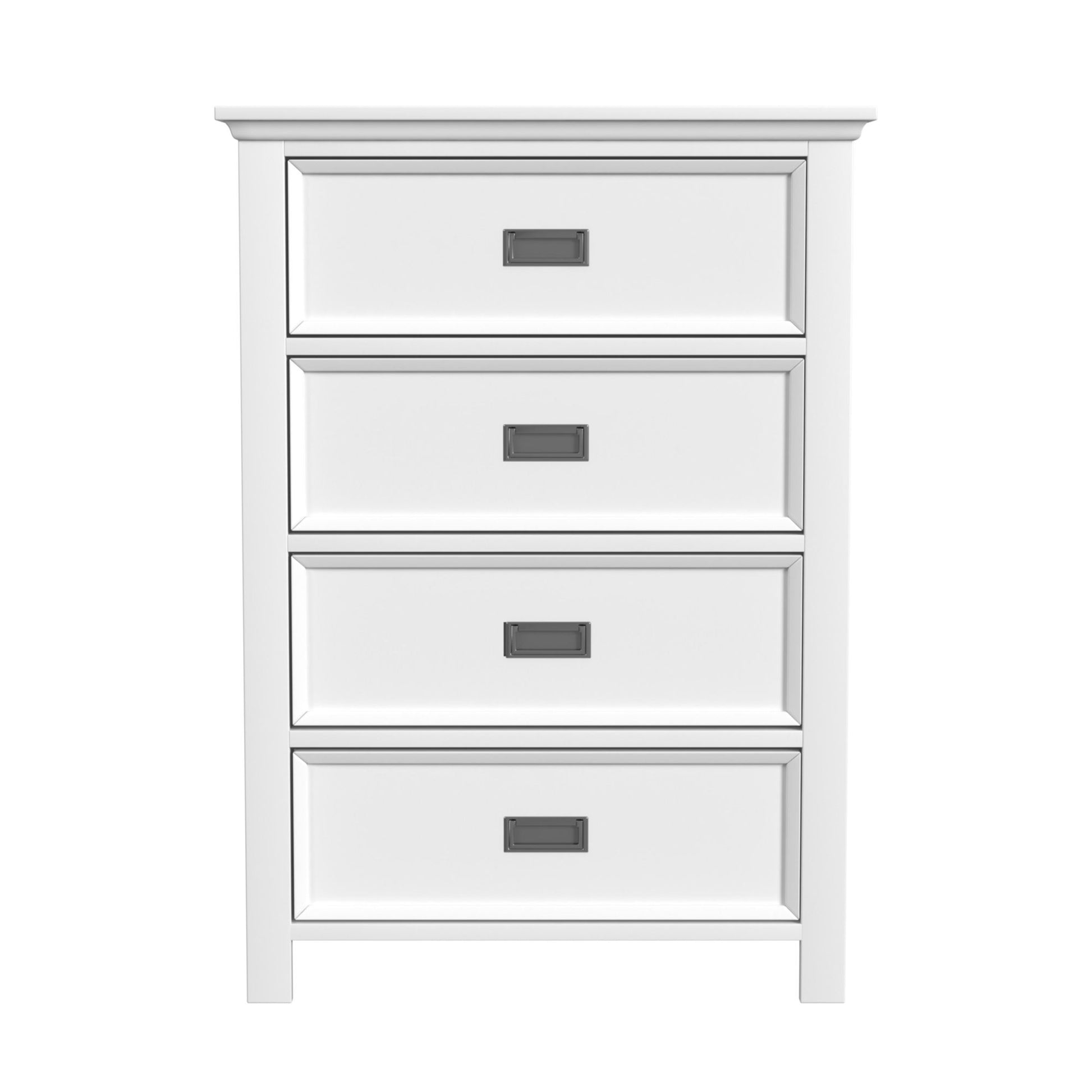 Complement your childÕs bedroom with the modern sophistication of the Hampton Kids 4-Drawer Chest in White. Designed with durability in mind, this chestÕs frame is built with solid wood and finished with a quality, grained oak veneer. Drawers with skillful dovetailing and ball bearing glides are outfitted with sleek and discreet metal pulls, while the top drawer is fitted with protective felt lining. For those seeking quality, style, and practicality, the Hampton Kids 4-Drawer Chest in White is the clear choice.