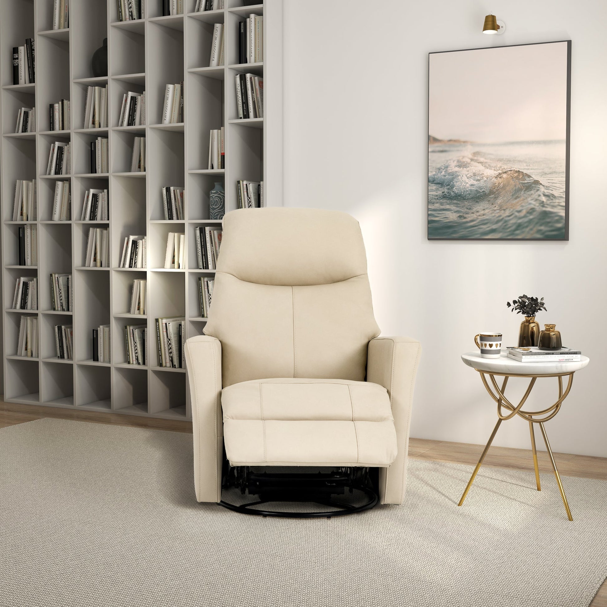 The Harlow Swivel Glider Recliner Chair combines classic comfort with contemporary design. This chair, upholstered in high-quality, easy-to-clean leather, has a soothing touch and is suitable for pets. It is built to last, with a strong wood frame and durable materials. Drawing inspiration from the lazy boy design, it provides excellent lumbar support and smooth reclining modes, making it suitable for both leisure and entertainment. Relax, lounge, or entertain; the choice is yours!