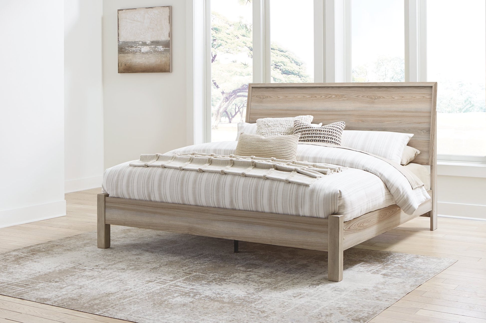 Modern meets neutral and sophisticated in this queen panel bed. Its clean lines and open slat headboard wake up your bedroom with eye-catching appeal. The natural finish and subtle replicated wood grain speak casual simplicity, creating a smart and stylish bedroom retreat. A refreshing take on style, indeed.| Full Dimension | 72.25W x 89.75D x 17H |