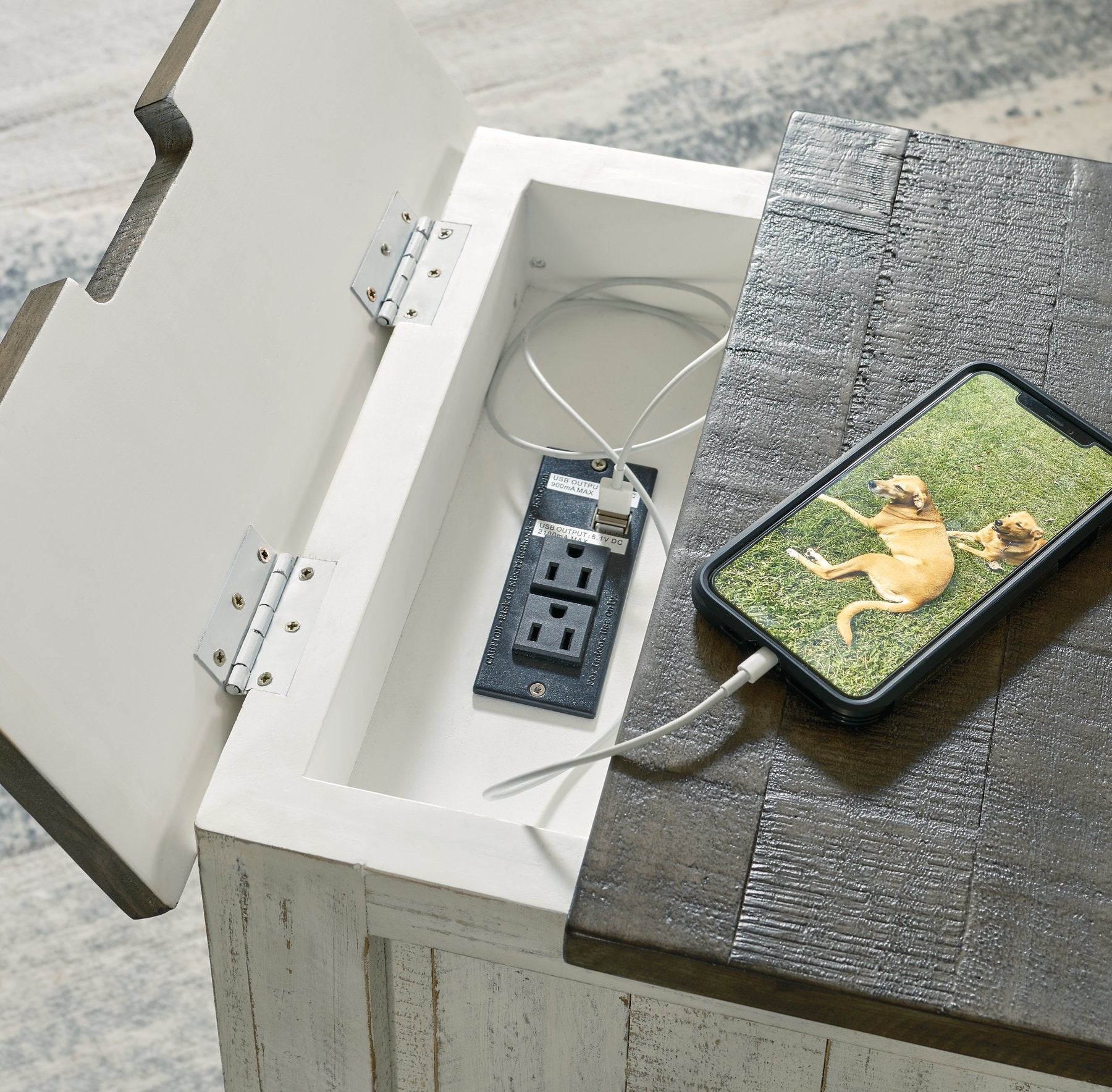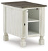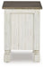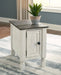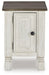 What a fresh interpretation of country classic style. Inspired by American farmhouse craftsmanship, but with an elevated sensibility, this chairside end table blends distinctive details such as turned post accents and raised door fronts for a substantial look that feels right at home. Those who appreciate rustic character should take note of the table’s thick crown moulding, beautified with a vintage two-tone finish. A small flip lid located on the top conceals a power outlet and USB ports to keep electronics charged up and close at hand| Full Dimension | 16W x 24D x 23H |