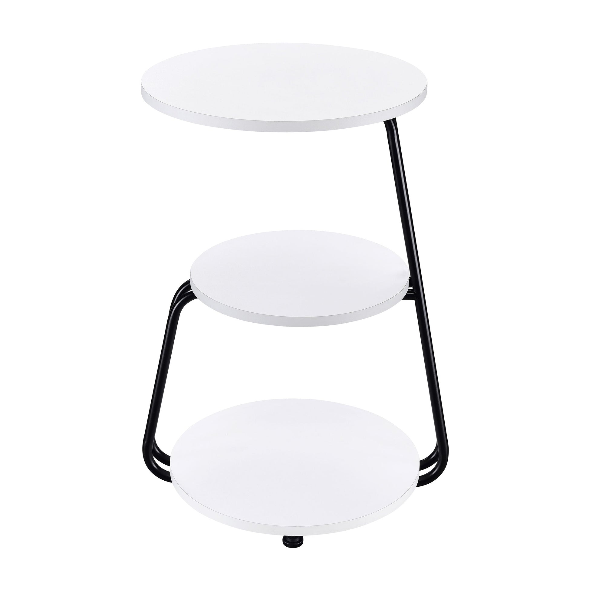 Put final touches on a modern living space with the sculpted flair of this contemporary accent table. The three-tier design is eye-catching and versatile, offering spaces for decor and essentials like a book or beverage. The table boasts a bright white finish over three tabletop surfaces, perfectly contrasting a black metal frame. The center shelf is a bit smaller than those on top and bottom, adding dimension and artistry in a sitting area or living room nook. Choose colorful accessories to make a splash in your living room.
