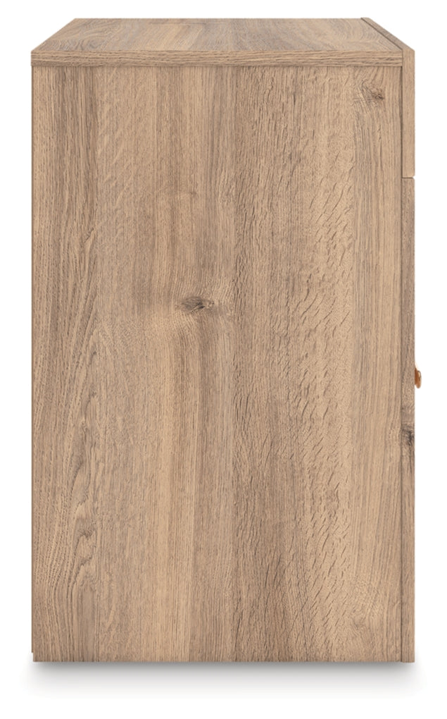 The natural wood tones and clean lines of this nightstand echo your easygoing style sensibilities. With a warm finish and replicated oak grain, its carefree character lightens up your bedroom. Curved inner corner details soften the look, while sleek bronze-tone hardware modernizes the feel. And for added convenience, USB ports keep your devices charged during pre-bedtime scrolling.