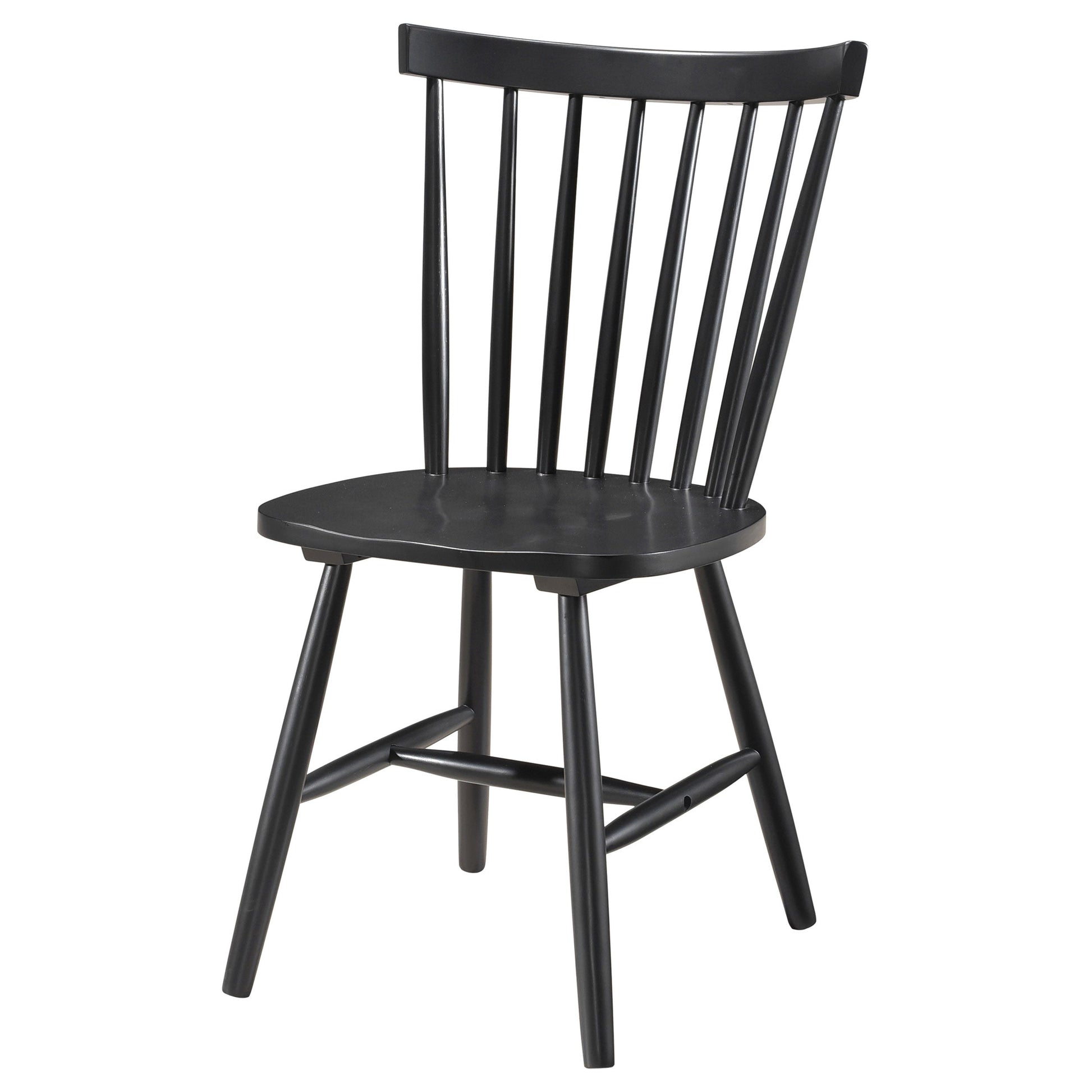 Enhance casual seating with the straightforward, timeless cottage character of a traditional dining chair. Perfect for the kitchen or dining room, it boasts stylish wooden construction from Asian hardwoods, complete with a crisp black finish that complements in a variety of kitchens and dining rooms. The chair features a classic spindle back, offering support with airy presence to lighten the overall look and feel of the chair. Its contoured seat is comfortable and stylish, perfect alone or with the addition of a cushion that adds style (not include). Flared legs complete the look, offering stylish, casual ambiance perfect for a cottage, farmhouse, or coastal kitchen table.