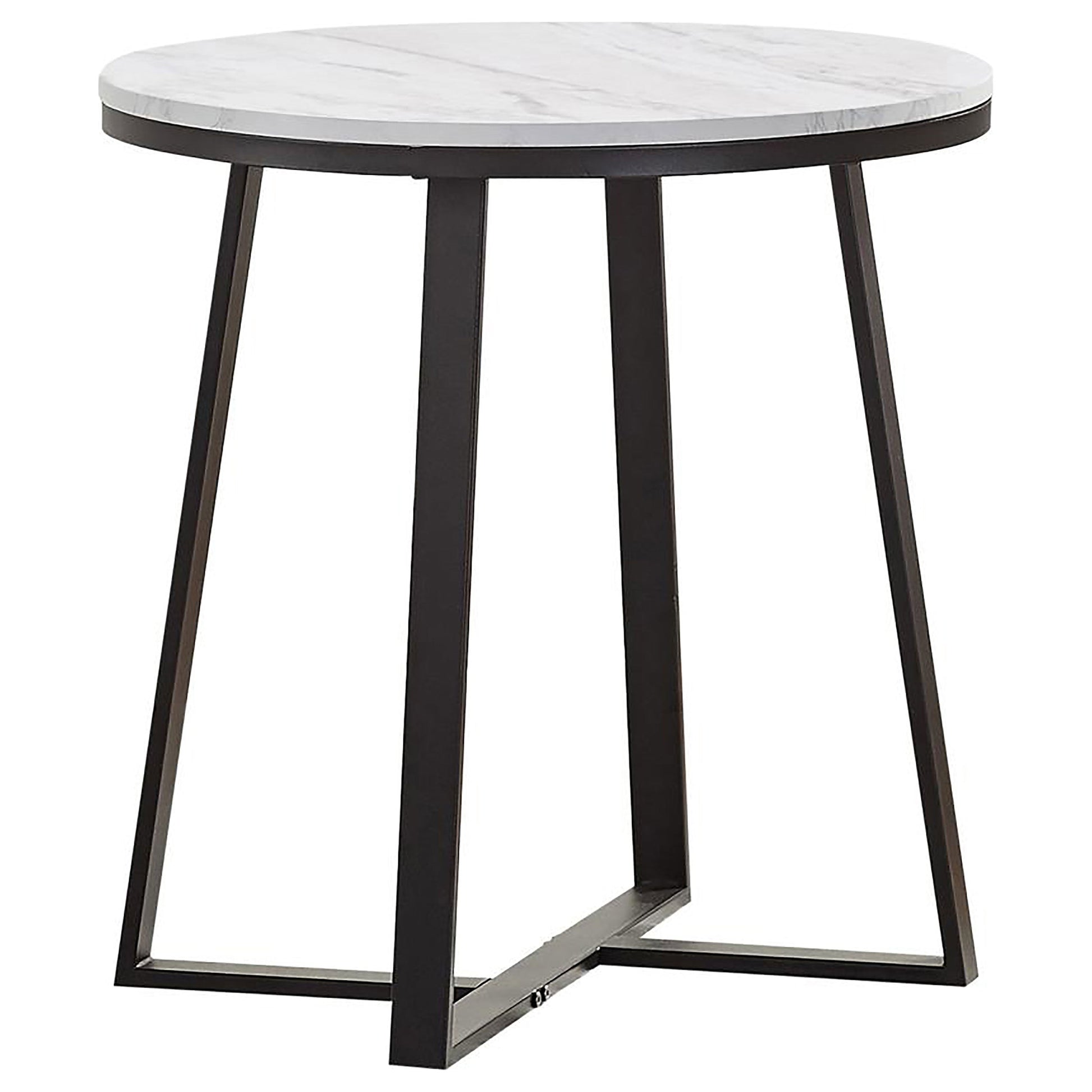 This modern end table combines bold design with a sleek two-tone finish, ideal for contemporary spaces. The round faux marble top in white adds elegance, while the matte black powder-coated metal base offers a sturdy foundation. The intersecting U-shaped legs create a geometric silhouette that enhances its visual appeal. Crafted from engineered wood, PVC laminate, and heavy-gauge metal, this end table is durable and stylish. Perfect for showcasing decor or serving as a versatile accent piece.