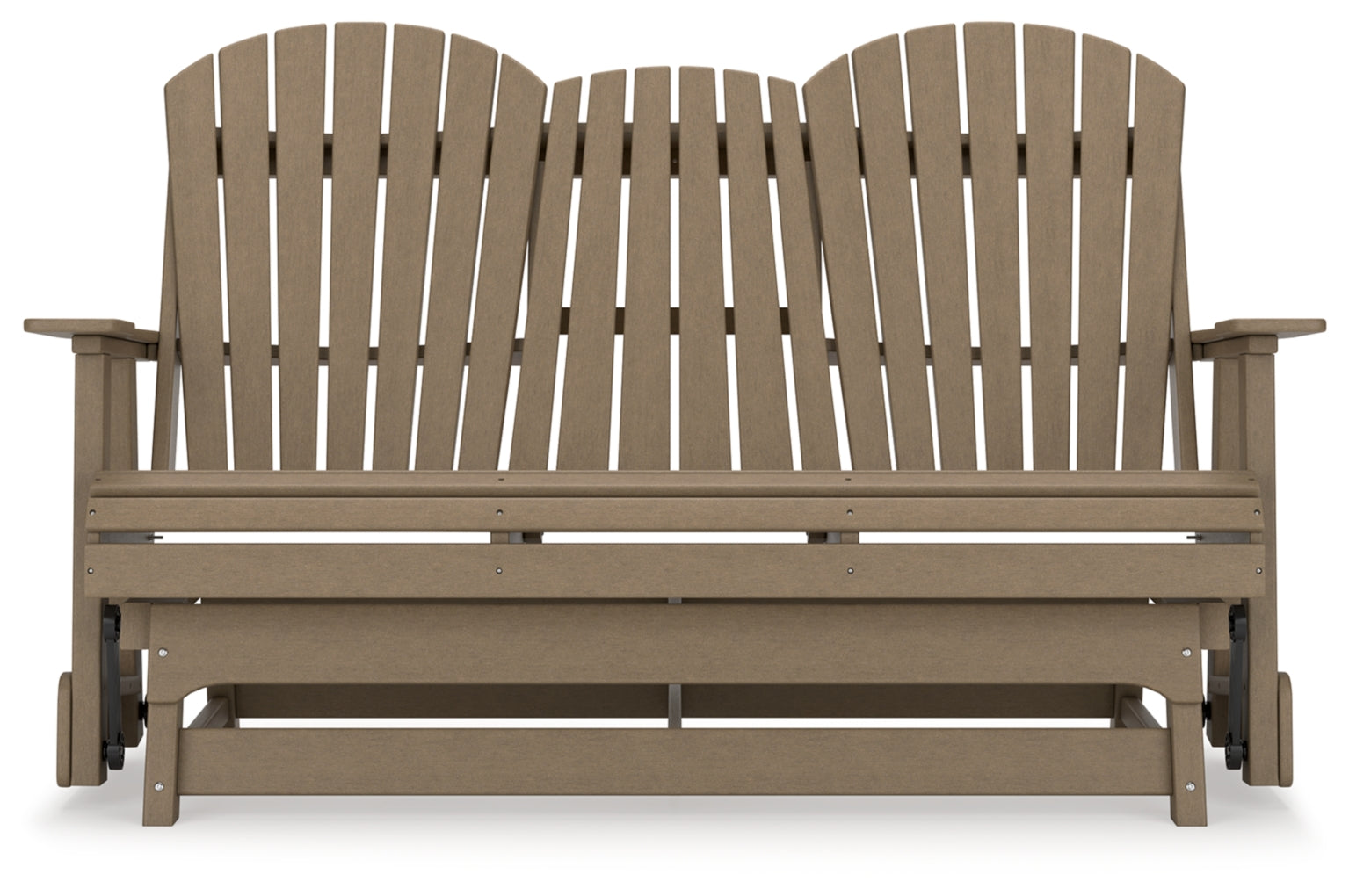 Drift away from everyday worries and into outdoor bliss with this glider loveseat. Dressed in an inviting driftwood hue, the Adirondack-inspired design has a classic feel. It weathers sunny summer days and cozy winter nights with durable MEGA-TUFF¨ HDPE material. A drop-down console with integrated cup holders keeps refreshments and snacks within easy reach. With the console snapped into the back, this loveseat has even more room for enjoying lazy days in the shade.