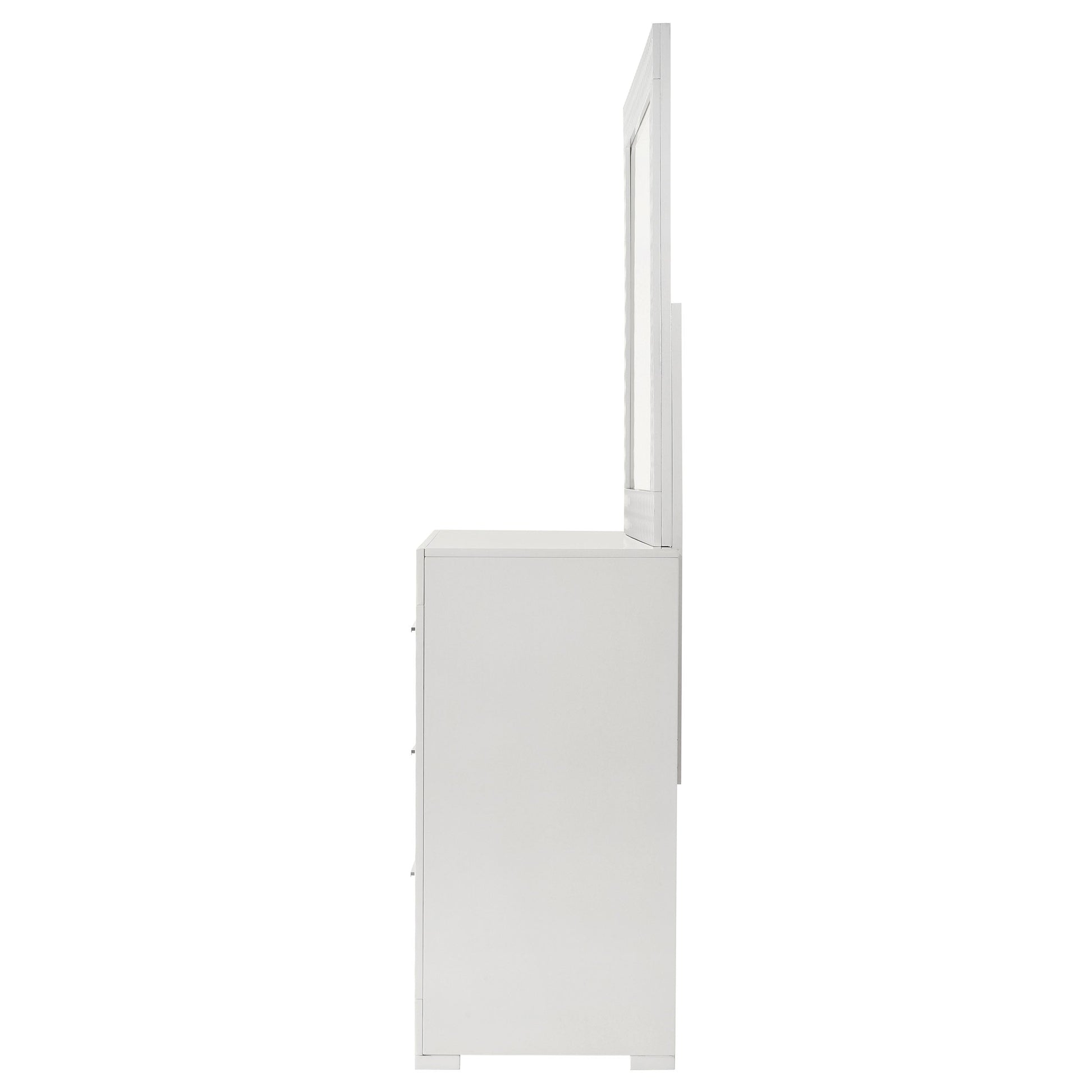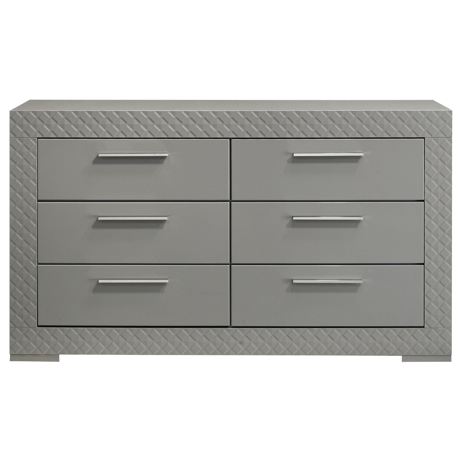 Bring a touch of modern luxury to your bedroom with this dresser and mirror set. Featuring a high gloss finish and 3-dimensional diamond tile emboss, this set exudes contemporary Italian style. The dresser offers ample storage with six spacious drawers, including felt-lined top drawers for delicate items. The matching mirror adds a cohesive element, enhancing the set's sophisticated design. This dresser and mirror set is perfect for those who appreciate refined aesthetics and quality craftsmanship.