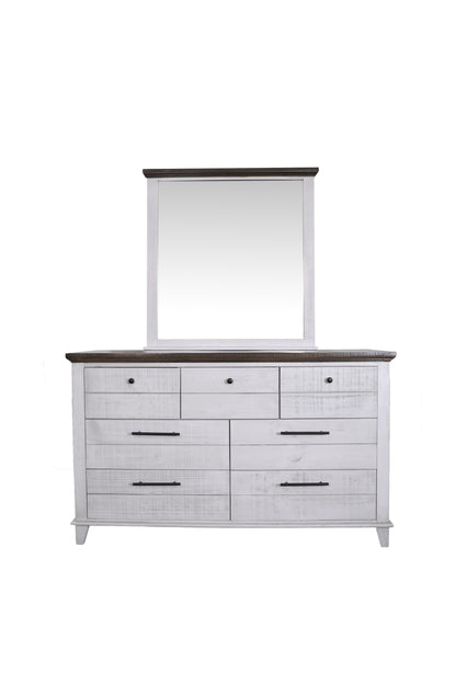 Elevate your bedroom with the Jalisco Dresser and Mirror. Designed with a rustic farmhouse look and a beautiful white winter finish, it's the perfect addition for a classic, yet modern feel. The striking black top and handles create a stunning contrast that will surely catch anyone's eye.