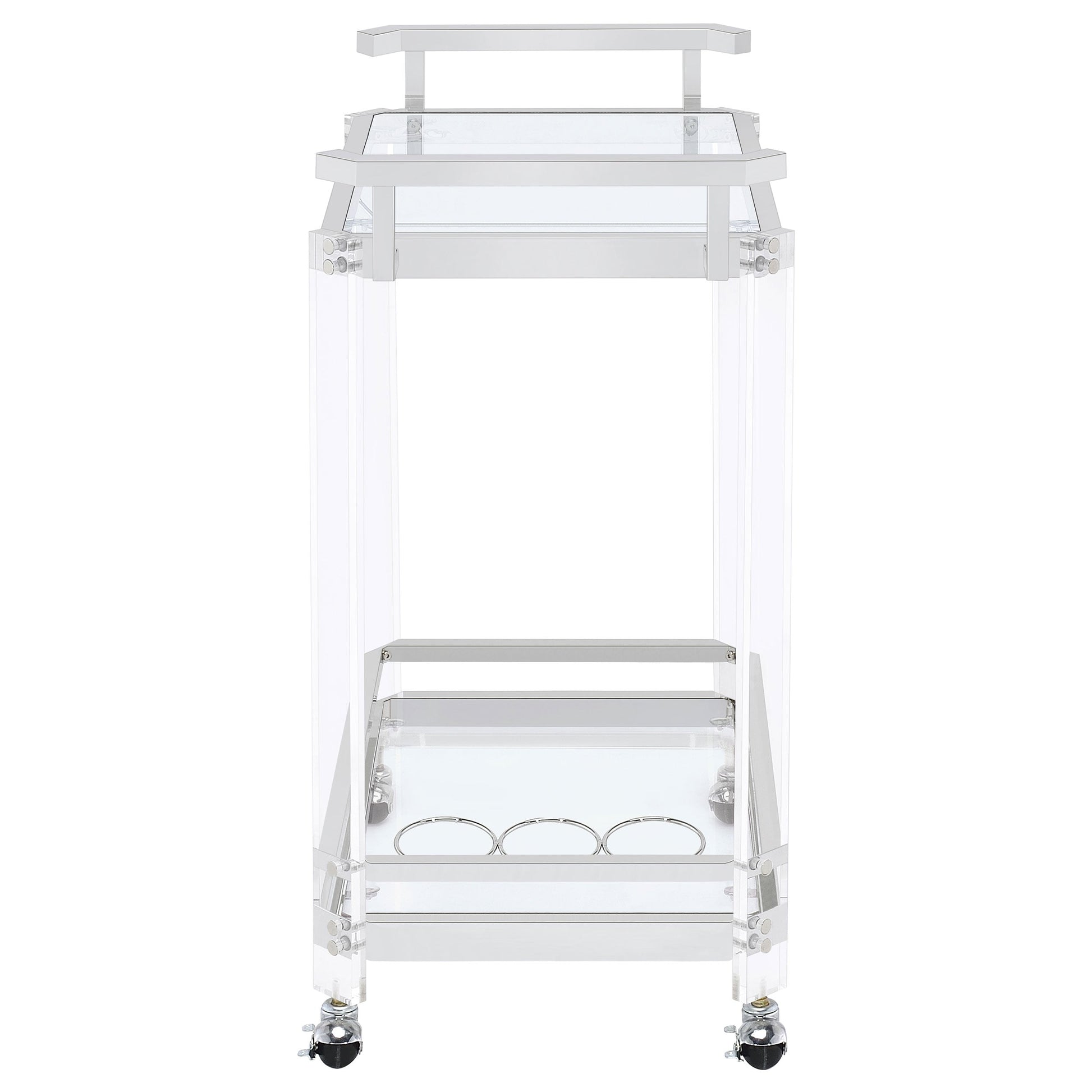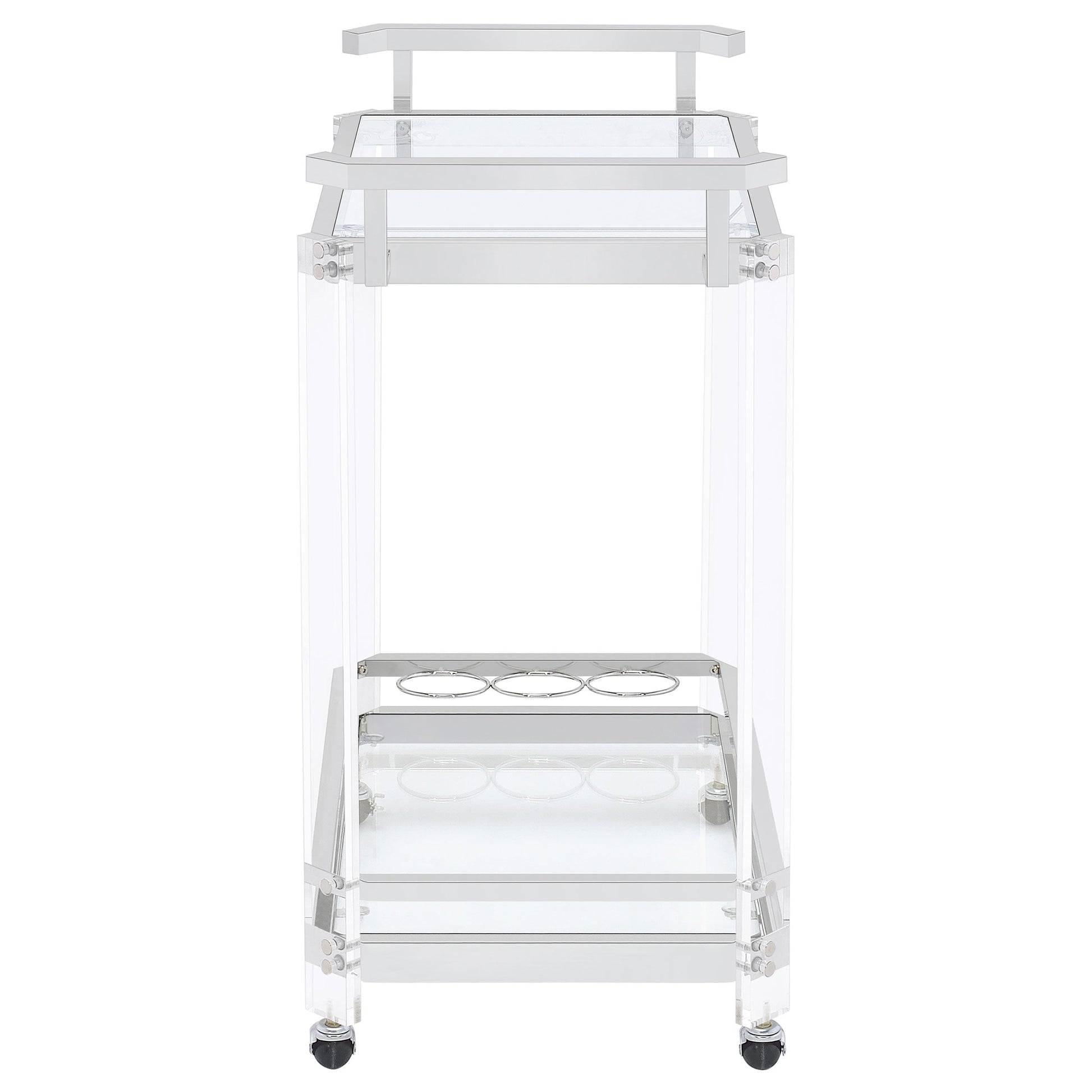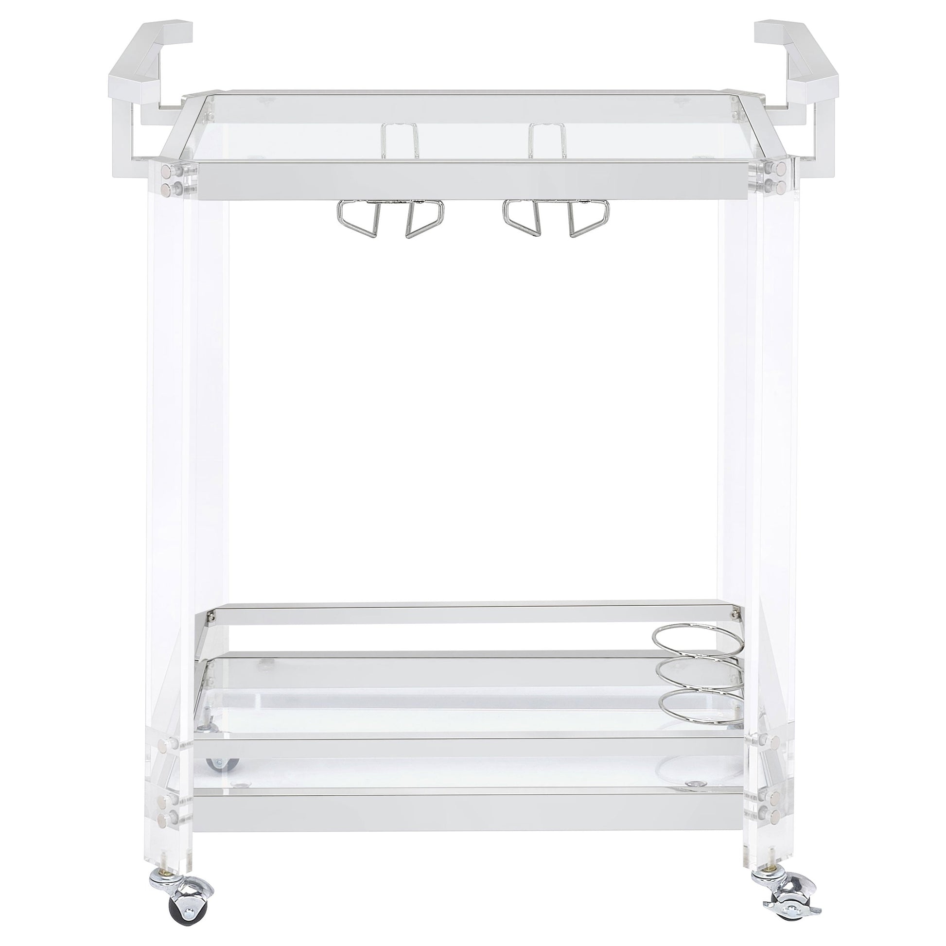 A serving cart is a delightful accoutrement for any home bar or indoor patio. This serving cart takes it to another level with an acrylic and metal frame finished in chrome. It features clear tempered glass shelves that's simple yet modern. Bottom shelf features wine bottle holders while top shelf features a stemware rack underneath. With convenient wheels, take this serving cart wherever drinks are in demand.