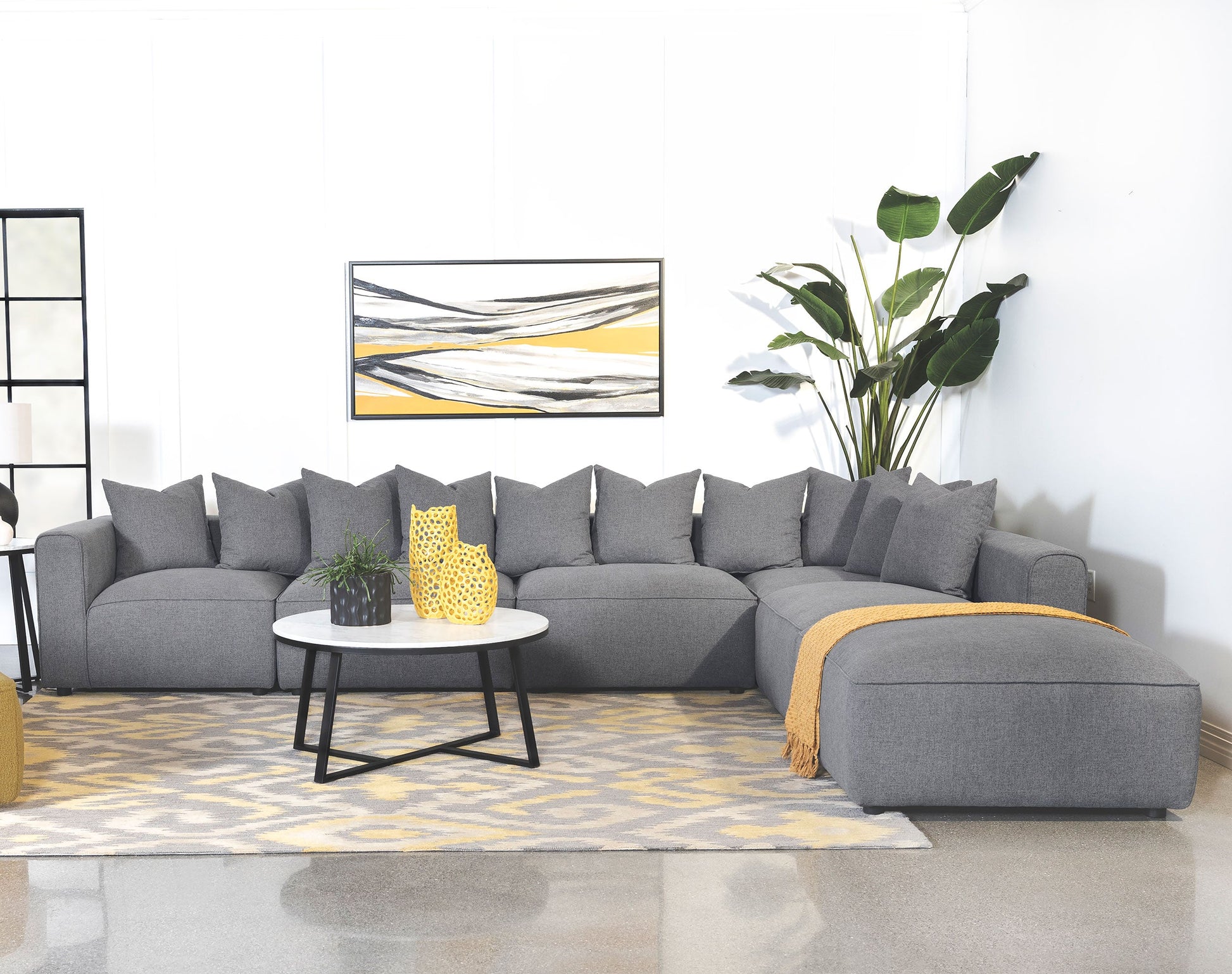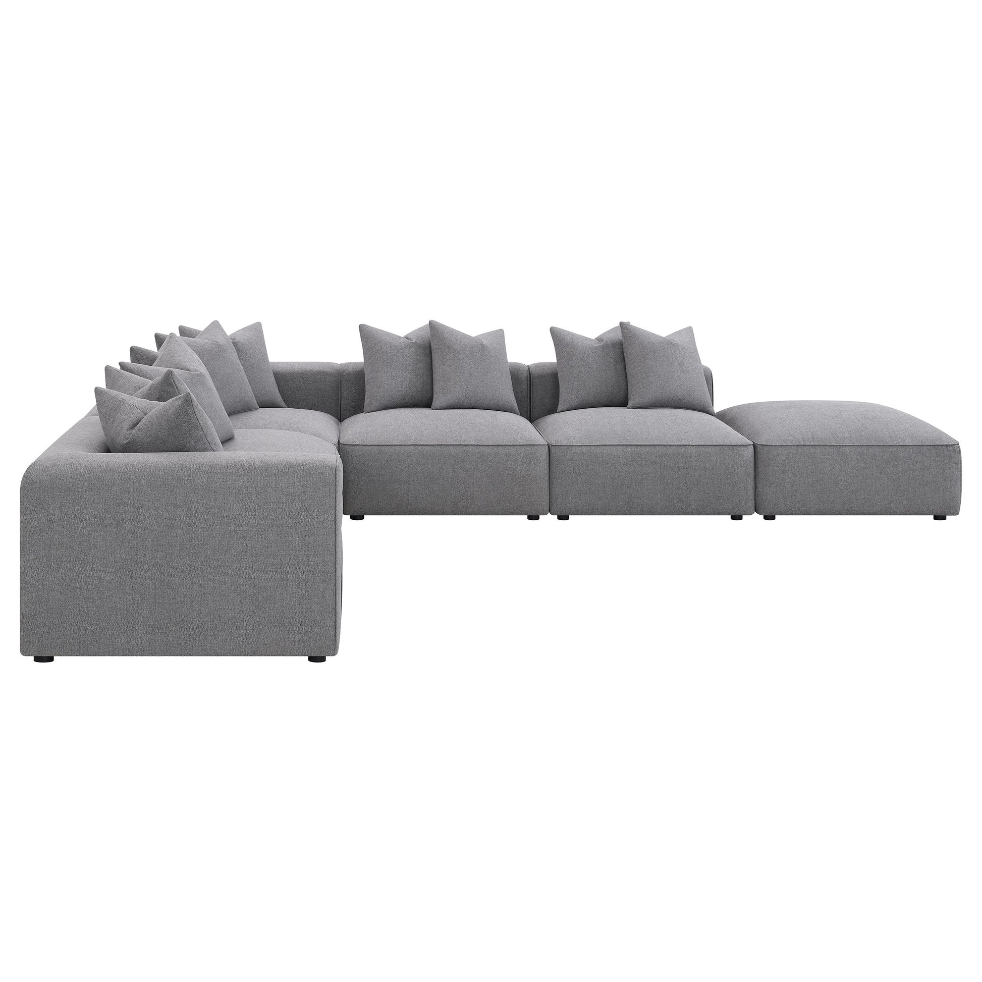 Gather around this large sectional sofa, featuring six modular pieces that invite you to rearrange it as needed for company and parties. Thick wide bases with waterfall edge-like profiles are accented with welt trim for a sleek tailored aesthetic. Perfect for accompanying your existing decor, the softly textured grey woven fabric offers a neutral and monochromatic color palette, welcoming fellow neutrals or adding a backdrop to vibrant colors. Matching pillows make up the back cushions, leaning back into track style armrests and backs. An ottoman easily transitions from a chaise lounge to a coffee table instantly.