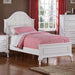 The Jesse Full Panel Bed guarantees sweet dreams for your little one. This delicate design features a faux leather headboard adored with chic white buttons. Beautifully arched cabriole feet and intricate moldings accent this lovely bed. With a contemporary style, this bed can easily blend into existing room decor! Your choice if a trundle is needed or not. Box spring required.