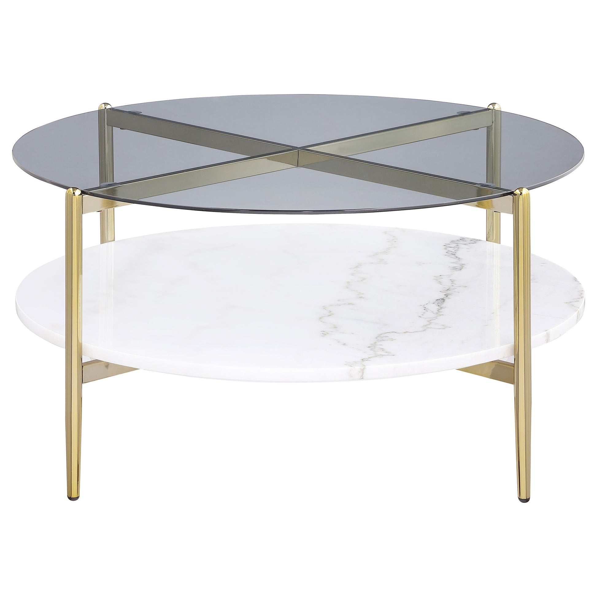 A luscious look, this modern coffee table creates a glamorous aura with its sleek glass and white marble elements. The round smoked tempered glass top rests upon a gleaming white marble shelf, bringing sophistication to any living room. The gold electroplated chrome metal frame, with slim, straight legs, adds a rich, polished finish. The table features crossing stretchers beneath the glass top for added distinction, offering both style and functionality in a luxurious, modern design.